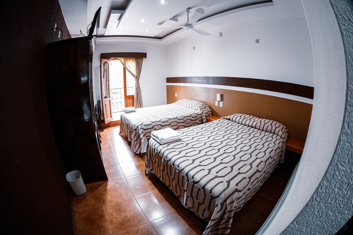Disfruta de la sencillez de este alojamiento tranquilo y céntrico. Está habitación ofrece una estancia privilegiada ya que es la única que cuenta con dos balcones y ofrece una vista privilegiada a la Iglesia Patronal de Jonotla, Puebla.