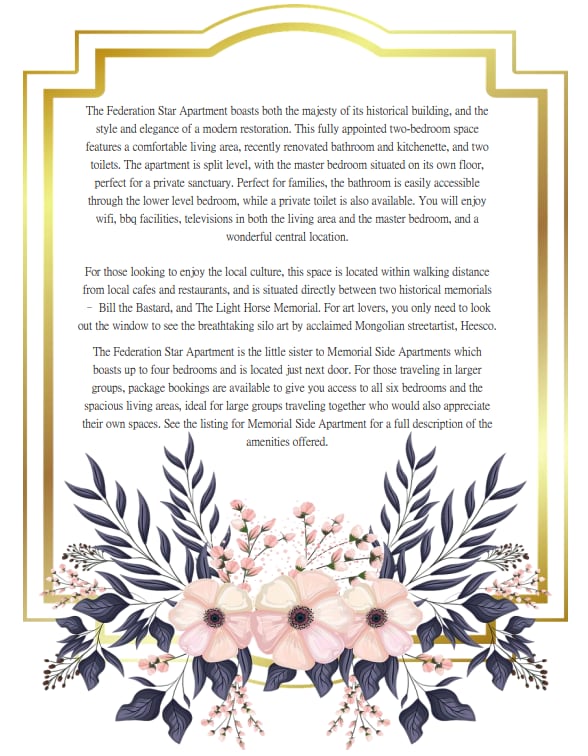The Old Bakery Guesthouse is a beautifully renovated and furnished self-contained apartment in the historic 1889 site of the original town bakery. Now with an EV charger (level 2), free to guests, the cosy and secure retreat is located in the centre of Harden, providing an ideal base for exploring the twin towns of Harden-Murrumburrah, as well as the broader Hilltops region.