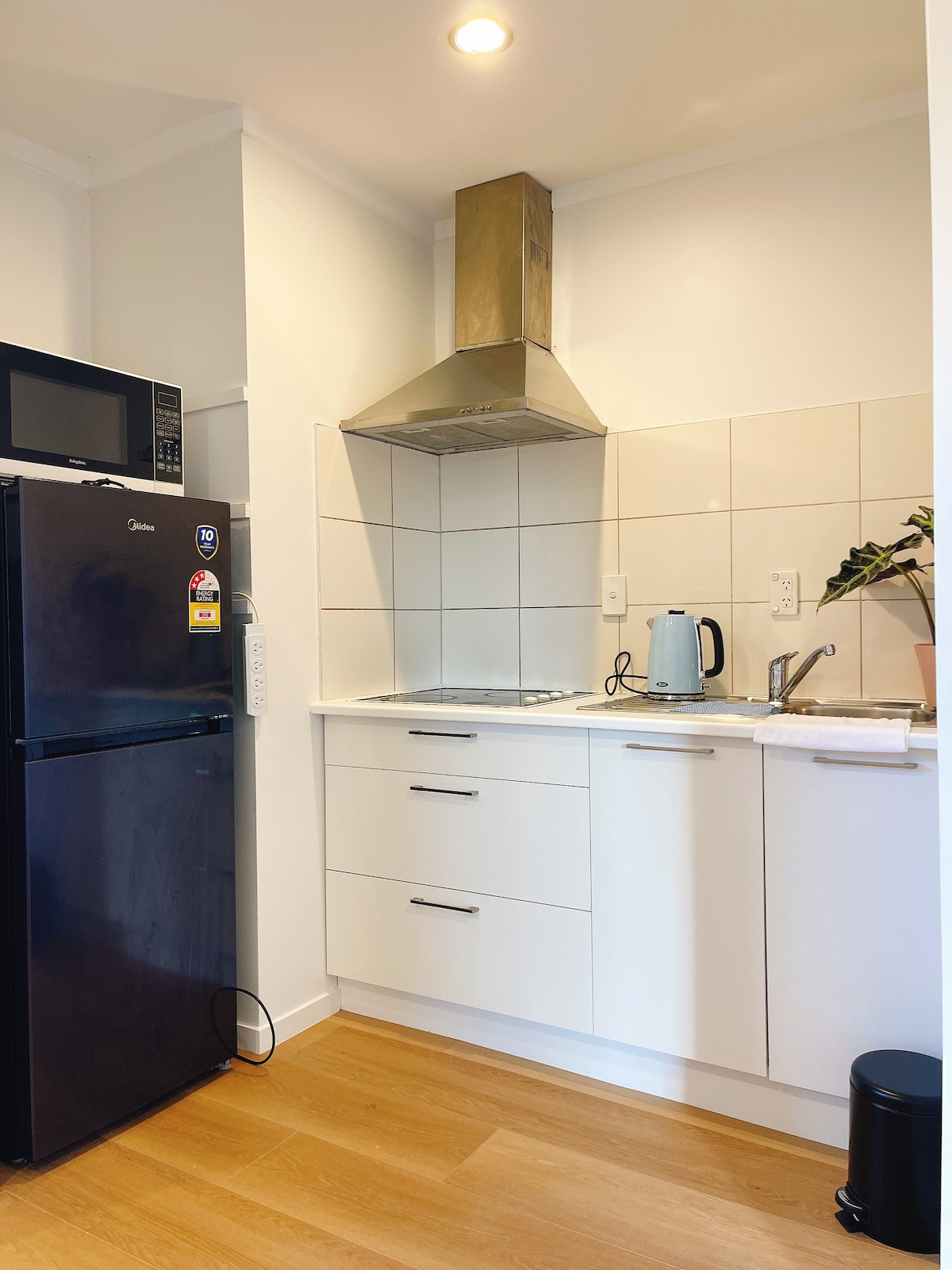 The three Air BnB rooms are downstairs. The hosts are upstairs. The bedroom which faces north, is very sunny and light. There are two chairs with a coffee table in the bedroom. There is also a kitchenette with microwave, fridge, toaster and sandwich press. There is a large table with 2 chairs in the kitchenette where you can eat and/or use your Laptop if you are working or you can use it for groceries etc There is a bathroom with toilet and shower There is a step up to the shower