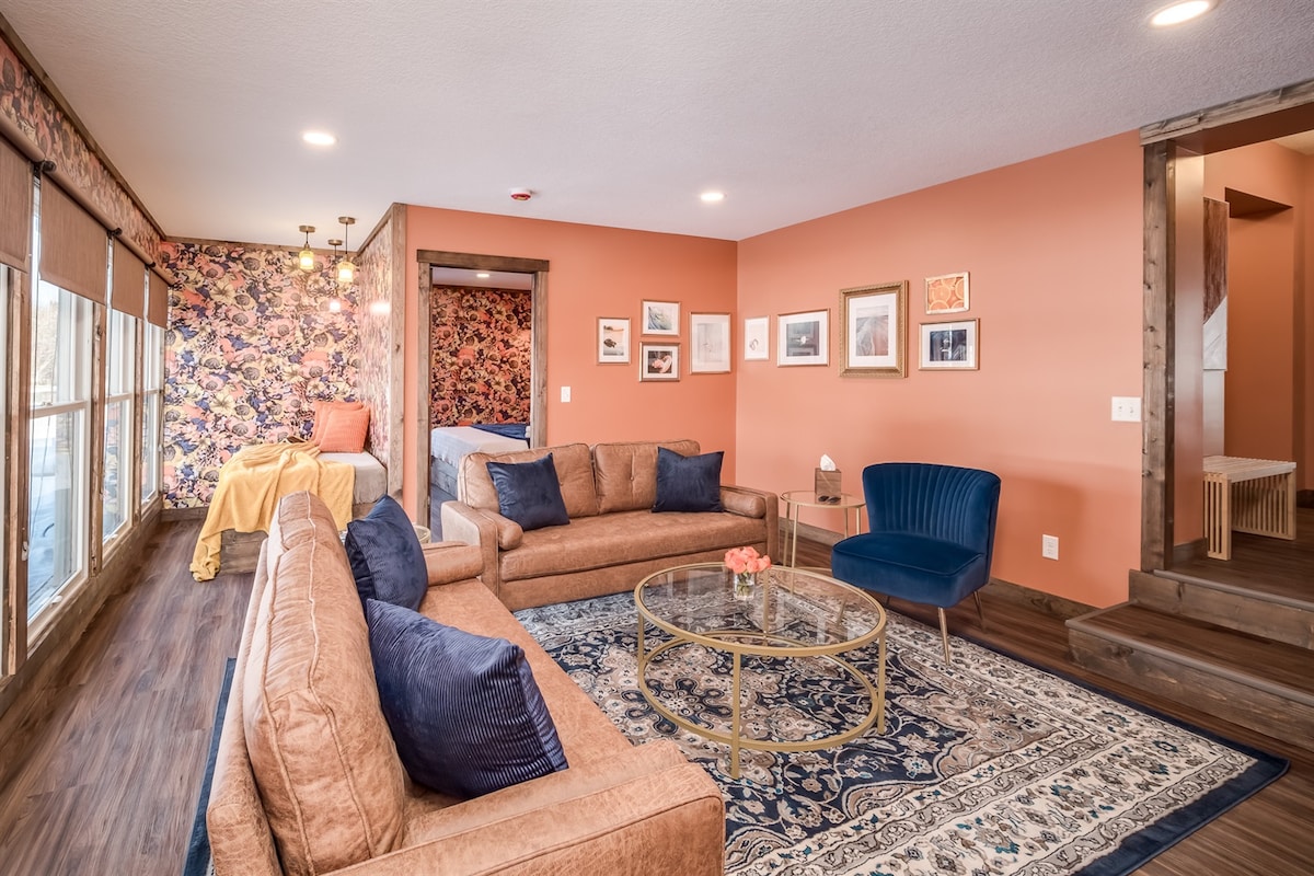 Private balcony with fire table + downtown views, 3 king bedrooms, and a cozy living room with electric fireplace. Enjoy a full kitchen, coffee bar, and access to our 2,000-sq-ft rooftop, arcade game room, and lounge spaces. Walk to bars, restaurants, shops, and marinas. Perfect for groups seeking style, space, and the best views in Prescott.