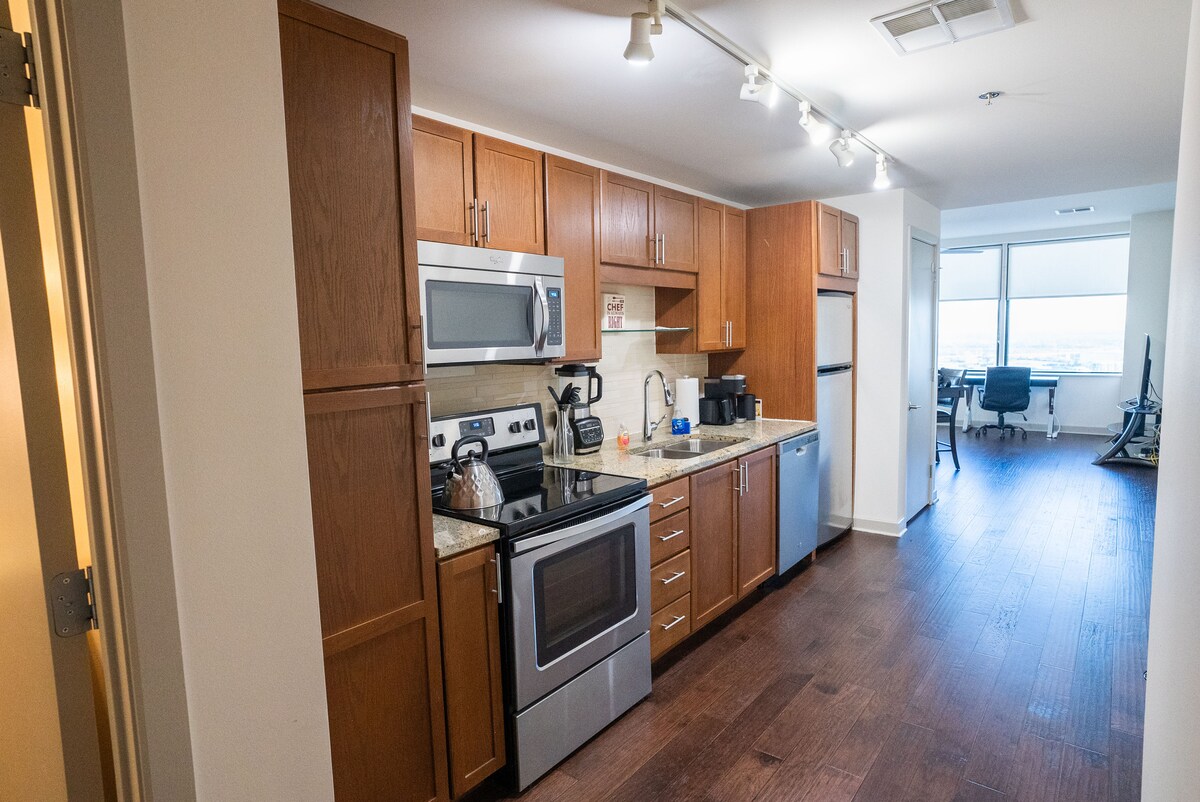 Experience downtown living in this newly updated 1BR high-rise apartment. Enjoy a spacious king bed, modern décor, fast WiFi, smart TV, and a fully stocked kitchen. Floor-to-ceiling windows offer bright city views, and the prime location puts restaurants, shops, and attractions just steps away. Perfect for work or leisure, this cozy urban retreat has everything you need for a comfortable stay.