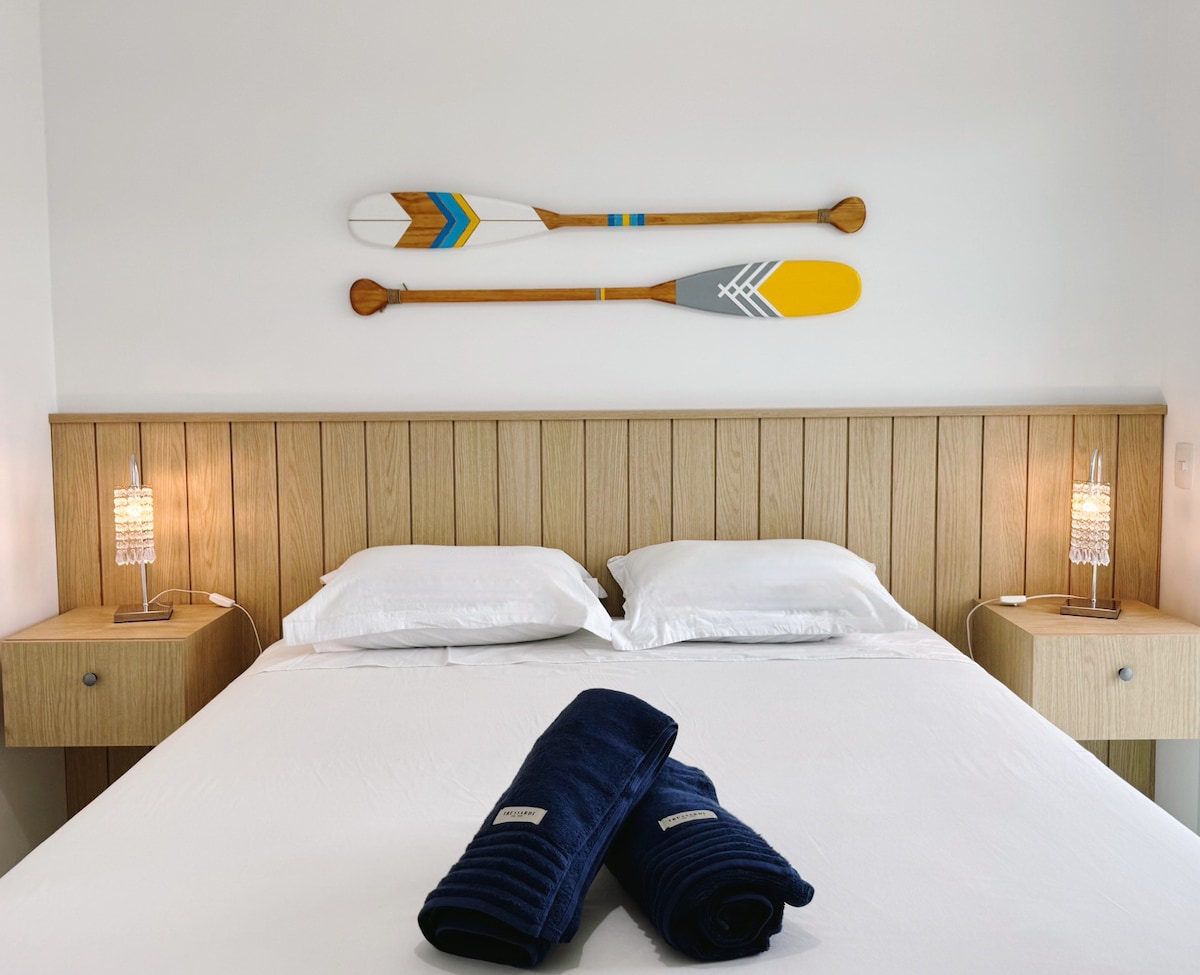 In Jurerê - the most famous beach in Florianópolis, with calm sea, beautiful landscapes and restaurants. You will have the privacy of a modern apartment with the convenience of 5-star hotel services, including daily cleaning. Perfect for couples, solo adventurers, business travelers, families (with up to two children, one of whom can sleep in a crib). Only optional hotel services: restaurant, breakfast or valet parking, are paid directly to the hotel.