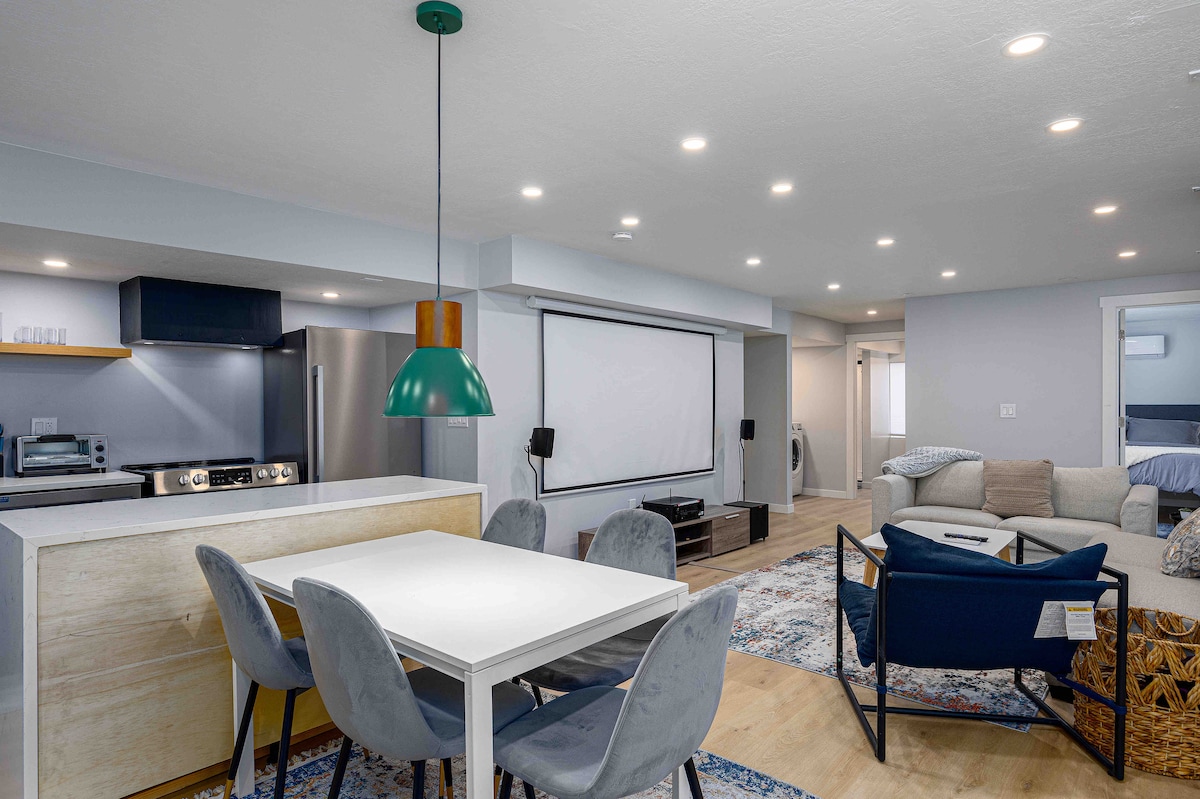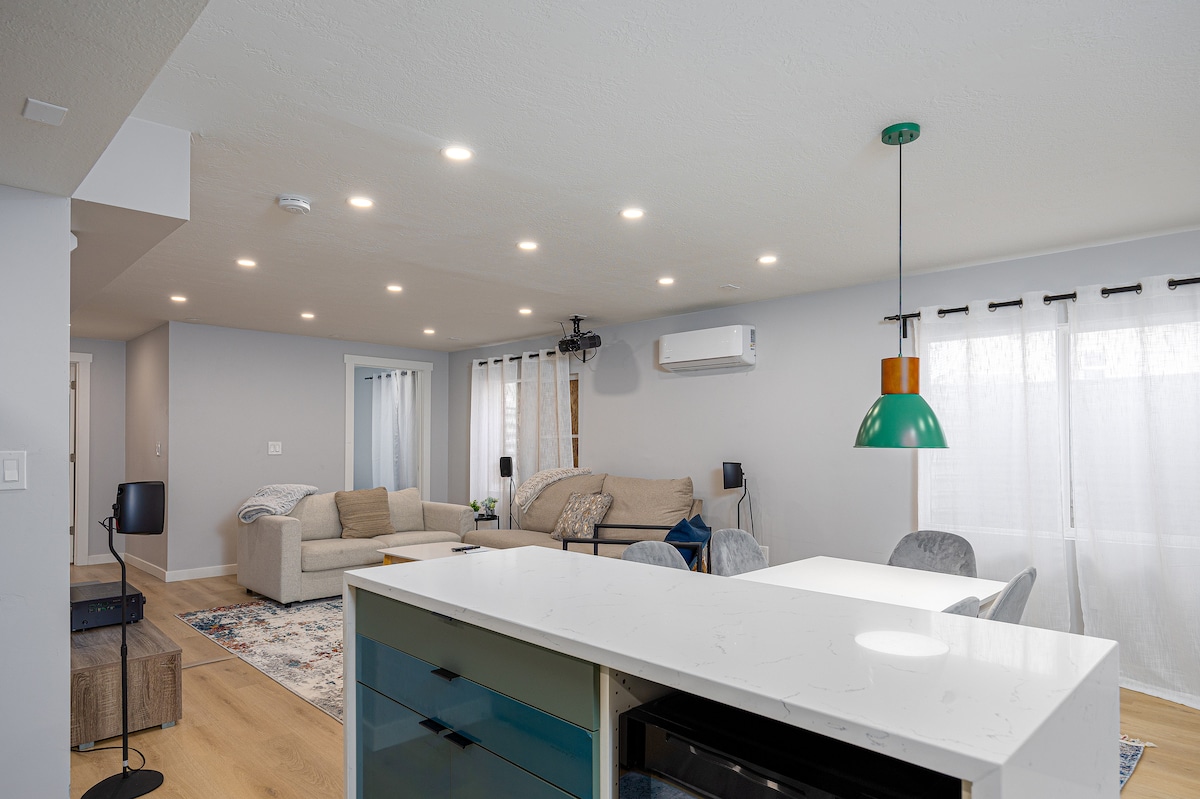 Step into our inviting basement hideaway, designed for unforgettable movie nights! Experience the magic of a private cinema right in our living room, featuring a massive 120" screen and immersive surround sound. ✔ SLC Airport: 3min ✔ Downtown SLC: 7 min ✔ Great Salt Lake: 30min ✔ Snowbird: 40min ✔ Park City: 45min ✔ Brighton/Solitude: 50min This cozy space is perfect for those who love to combine comfort with cinematic thrills.