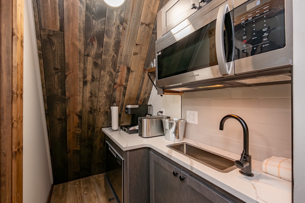 Recharge in style in this thoughtfully designed retreat, where a plush King bed, warm electric fireplace, and all the comforts of home come together for the perfect mountain getaway. The luxurious bathroom features a walk-in shower with premium bath products, and the kitchenette gives you the freedom to enjoy meals at your own pace. A Smart TV keeps you entertained whenever you need it. Step outside onto your deck to sip your morning coffee or wind down after a full day of lake adventures.
