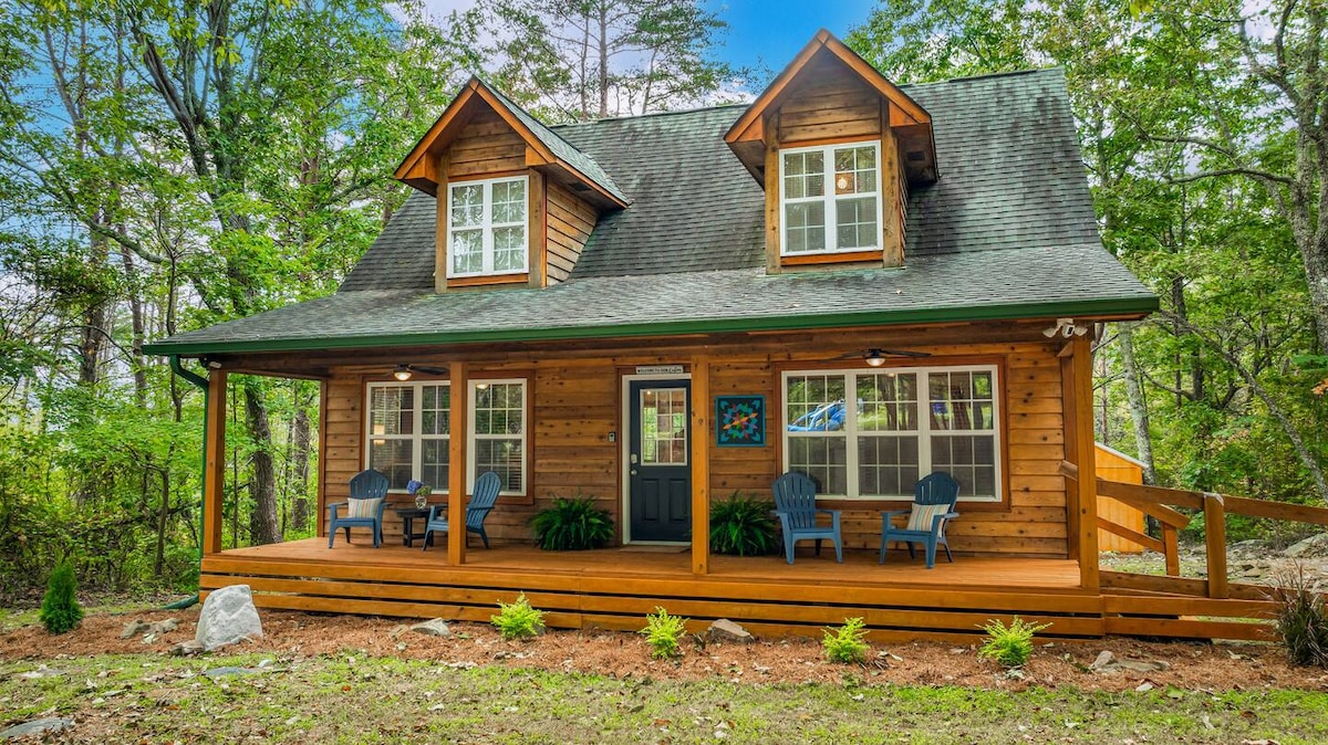 NEW! Designer-decorated cabin, JUST REMODELED w/ new spa style tile shower. Features wooded views, private hot-tub, fireplace, fire-pit, smart TV's, & WIFI. All just 5 minutes from DeSoto Falls. just added new driveway that allows entrance to cabin w/ just 4 steps. This spacious yet cozy-feeling retreat has something for everyone to enjoy! Cabin allows for pets under 25 pounds. No retrievers or heavy shedders. It shares a driveway w/a cabin which is close. Be careful- acorns falling in fall.