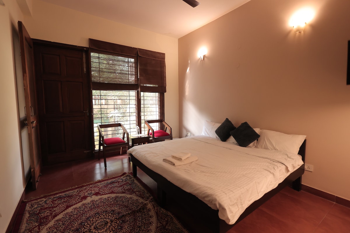 The house is superbly located, within a beautifully gated & highly secure society, away from hustle & bustle for a comfortable stay. With a touch of luxury, beautifully designed, airy & thoughtfully equipped with 100% power backup this home is the perfect base for your getaway. This tranquil stay is surrounded by greenery in abundance. The house has an open-plan design which flows from lounge-kitchen-dinning-bedrooms onto our SPACIOUS garden for you to enjoy the rising Sun.