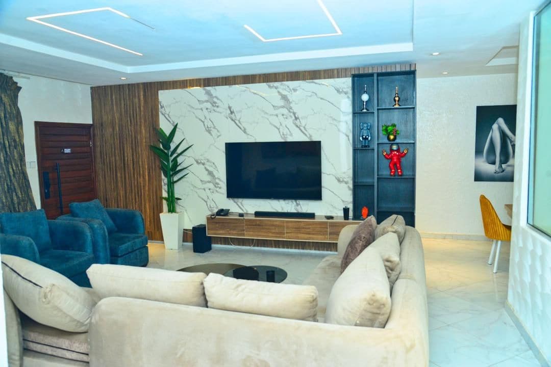 Domi Smart Luxury Apartment is a tastefully finished 2 bedroom flat. The apartment, 20 minutes (13km) away from the Airport, is fitted with state of the arts interiors and smart technology providing unequalled comfort and luxury in the secured, serene and peaceful suburbs of Okhoromi, GRA, Benin City. To maximise comfort, the apartment, fully air-conditioned, has guaranteed 24 hour power supply, laundry unit, internet with, smart TV with NETFLIX account. Enjoy excellent and clean free parking.