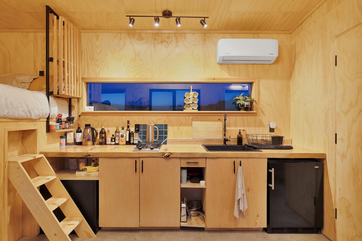 The Overlook sits perched above an untouched valley that stretches into textured hills and horizon beyond. Here, your tiny house awaits. Open the double doors and find all you need. A cantilevered bed above couch, 10’ kitchen counter, bathroom with fully tiled rain-shower and composting toilet, dining/work nook, and outdoor barbecue/seating area. Come step away. Reconnect. Cook. Read. Write. Lounge. Think. Come discover a slightly different way of doing things. Welcome to The Overlook.
