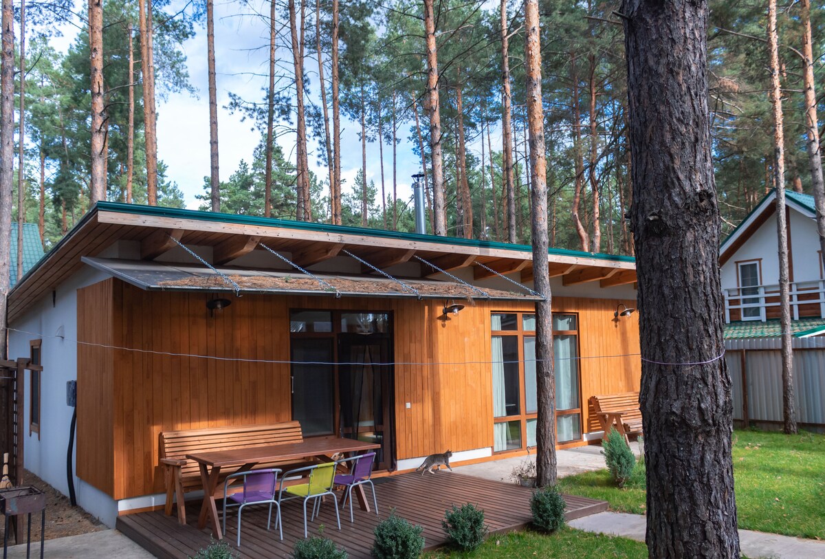 Уютный и теплый деревянный дом находится в сосновом лесу на территории коттеджного городка. Здесь можно провести выходные, каникулы или просто жить вдалеке от города посреди соснового леса. В доме есть оборудованная кухня, бытовая техника и камин. Дом окружен соснами, а река всего 10 мин пешком. Расстояние до Киева 40 мин на авто.