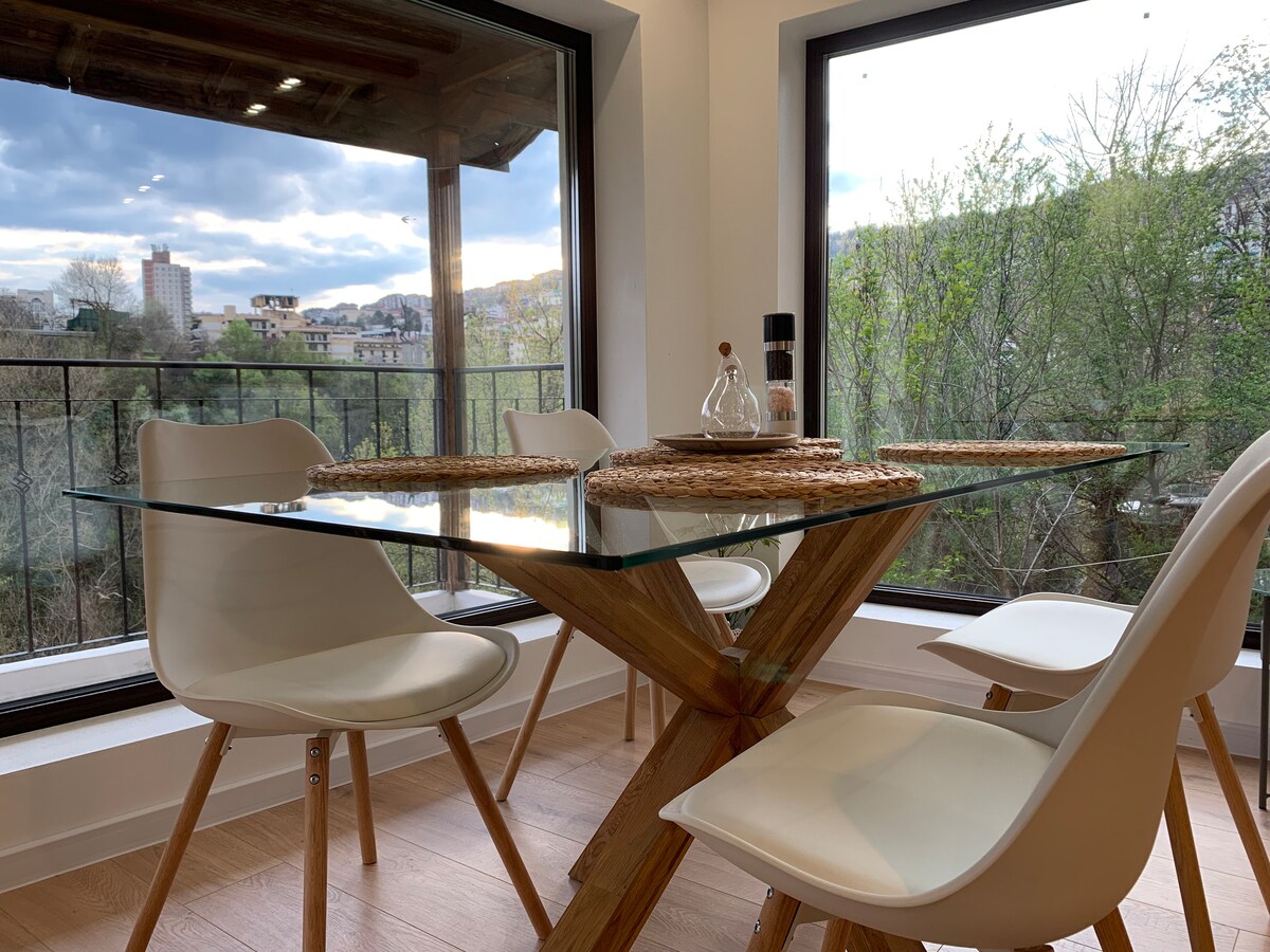 We are happy to welcome you to our lovely apartment in the heart of Veliko Tărnovo, with unique view to the City Gallery, the Assen Dynasty monument and Yantra river. Our newly renovated and private dwelling has all necessary amenities. Contains of two bedrooms, a large living room with kitchen, a bathroom and two toilets. The picturesque balcony view is breathtaking and will let you experience the spirit of the heart of the old capital of Bulgaria.