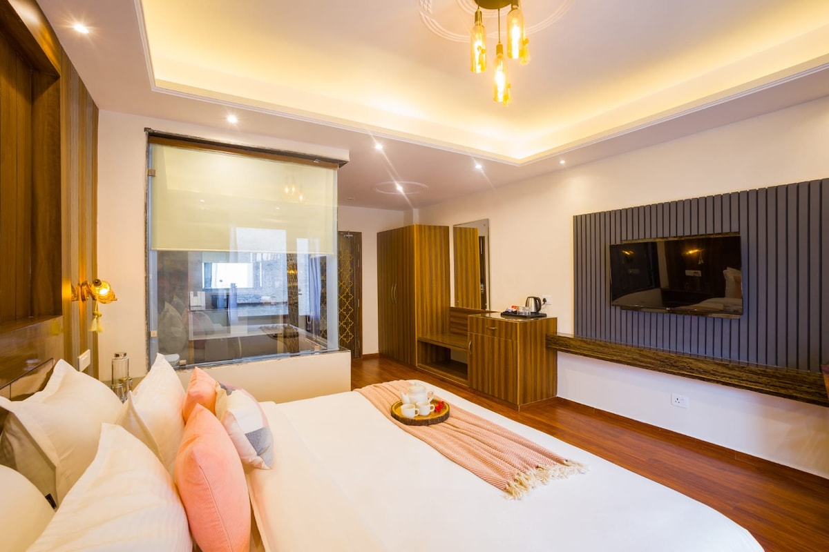 This stylish and unique place sets the stage for a memorable trip. Relax with the whole family at this peaceful place to stay. Located amidst nature, The Suite Room offers a Beautiful One Bedroom Space with Modern luxurious interiors and Amenities. No Room in the hills feels like one without being able to Ever Sit outside and embrace the marvelous beauty of Hills, a spacious Open Sitting area is the plus that makes the experience outstanding. 1. Parking available in the property- 10+ cars