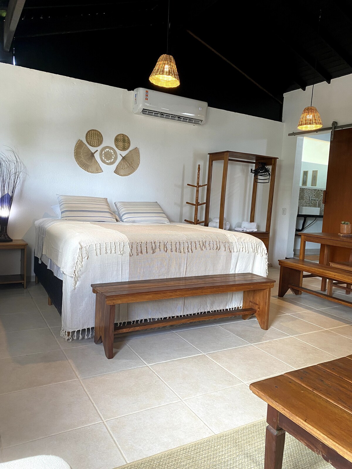 Take it easy at this unique and tranquil getaway. The Studio was designed and planned for those who want to enjoy a place of peace, tranquility and quiet close to nature and the beautiful beaches of Trancoso and the region. The entire environment provides an incredible view of the treetops of the Condominium Forest, which are airy, air-conditioned, modern and elegant with a rustic touch, thus providing unique moments for the couple. It has 1 queen size bed for 1 couple.