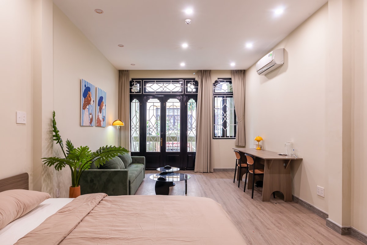 Enjoy a stylish experience at this centrally-located studio. - Only 11 minutes walk to Ben Thanh market, 23/9 park, 8 minutes walk to Bui Vien street and many spots in downtown. - Independent studio on 2nd floor with elevator, balcony and self-check in code. - Fully stocked kitchen with everything you might need. - Comfy bed for 2. - Smoking at the balcony (no smoking inside).