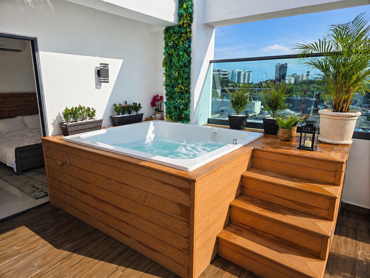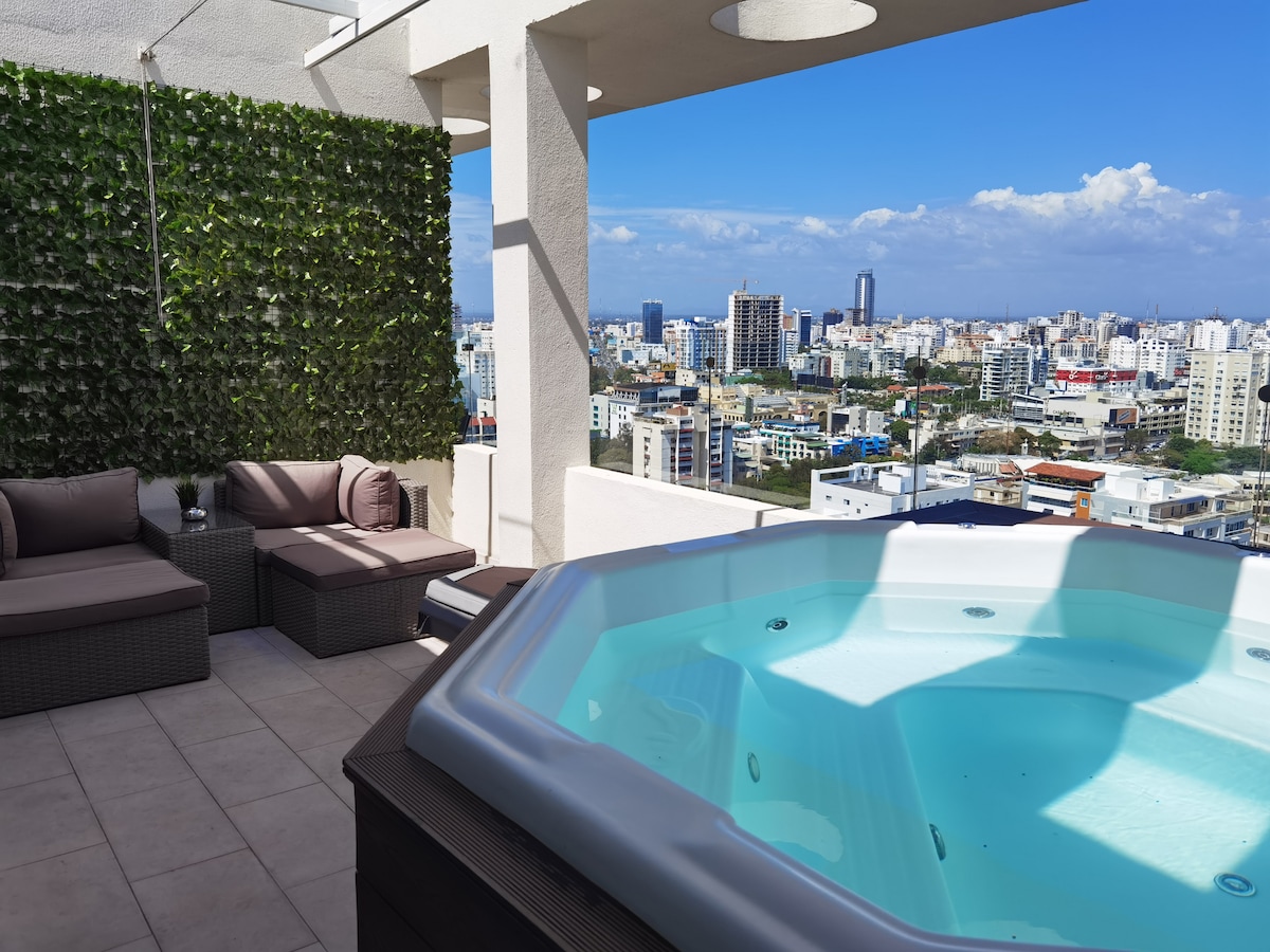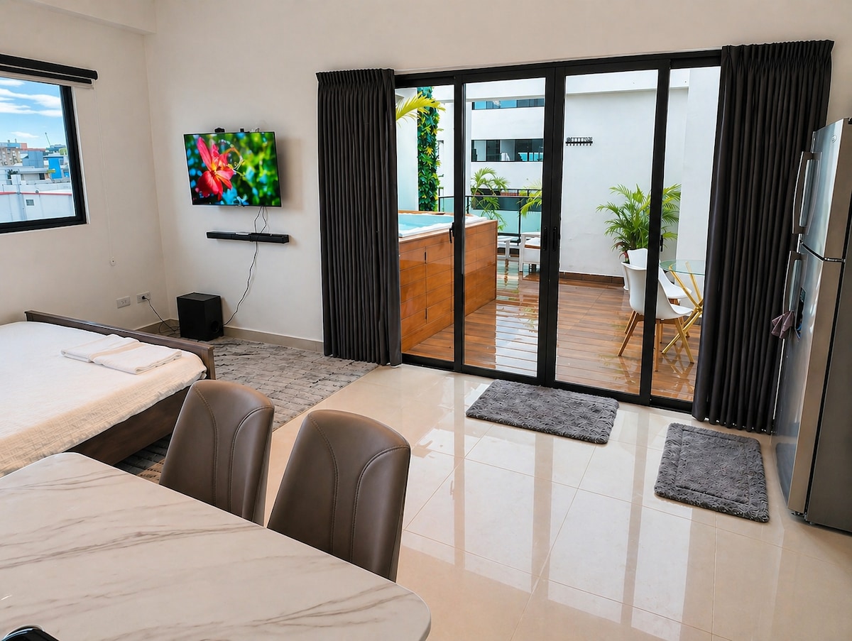 Luxury apartment w/ private Jacuzzi + terrace ✨ • 13 min from Zona Colonial • King bed 🛏 + full A/C ❄️ • Fast Wi-Fi + workspace 💻 • Smart TV 📺 + equipped kitchen 🍳 • BBQ area for relaxing 🍖 • Secure private parking 🚗 • Near supermarkets & restaurants • Ideal for couples & remote work • Perfect for short & long stays 🥂
