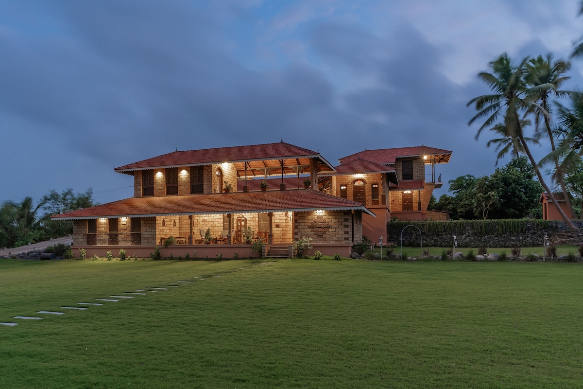 This homestay is a stunning riverside retreat surrounded by lush greenery, mango orchards, and scenic countryside. Built with traditional stone architecture and terracotta-tiled roofs, it exudes rustic charm while offering modern comforts. The property features a spacious lawn, a serene infinity pool overlooking the river, and swaying coconut palms, creating a tranquil escape. Perfect for nature lovers, it provides activities like birdwatching, farm tours, and rejuvenating wellness experiences.