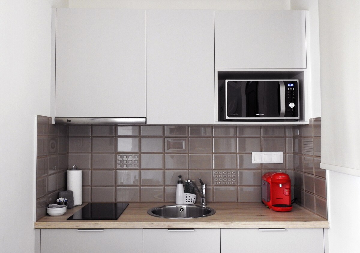 The comfortable studio is 25m² featuring 2 single beds that can be joined to form a double bed and a sofa bed and a kitchenette. It is equipped with everything you need for a relaxing and safe holiday.The studio is for private use (not shared with any other guests).The beach of Kamari and the bus stop is just 2 minutes away. One of the main advantages is its location, offering easy access to shops, restaurants, and a 24h market. It is well connected by bus to Fira town and the rest of the island