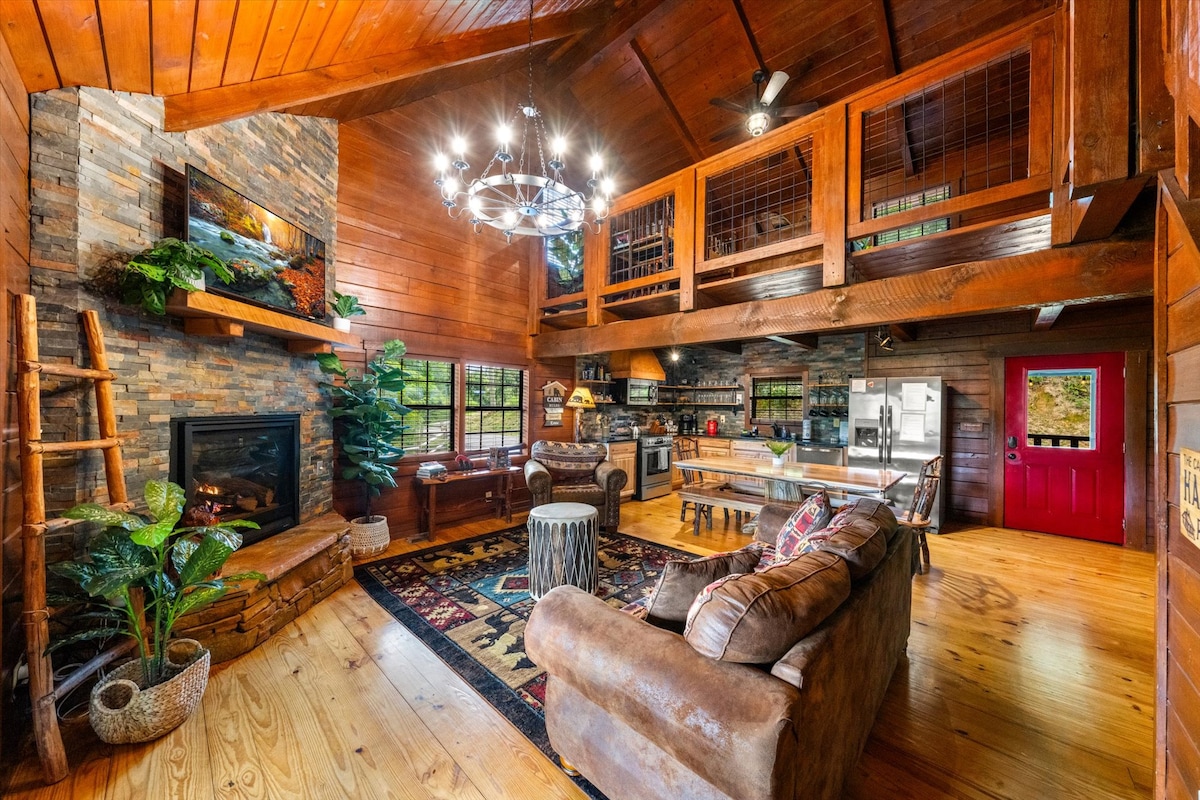 True log cabin in much sought after area of Gatlinburg! You will love the spacious great room with high ceilings, living room, gas log fireplace, kitchen, game area with pool table and dining area. Upstairs is a loft/master suite with king bed, full bath and a cedar sauna! Step outside to the wrap around deck, and hot tub, with plenty of room to enjoy relaxing in rocking chairs or outside dining. Only five minutes to downtown Gatlinburg, the Ski Resort or the Great Smoky Mountains National Park!
