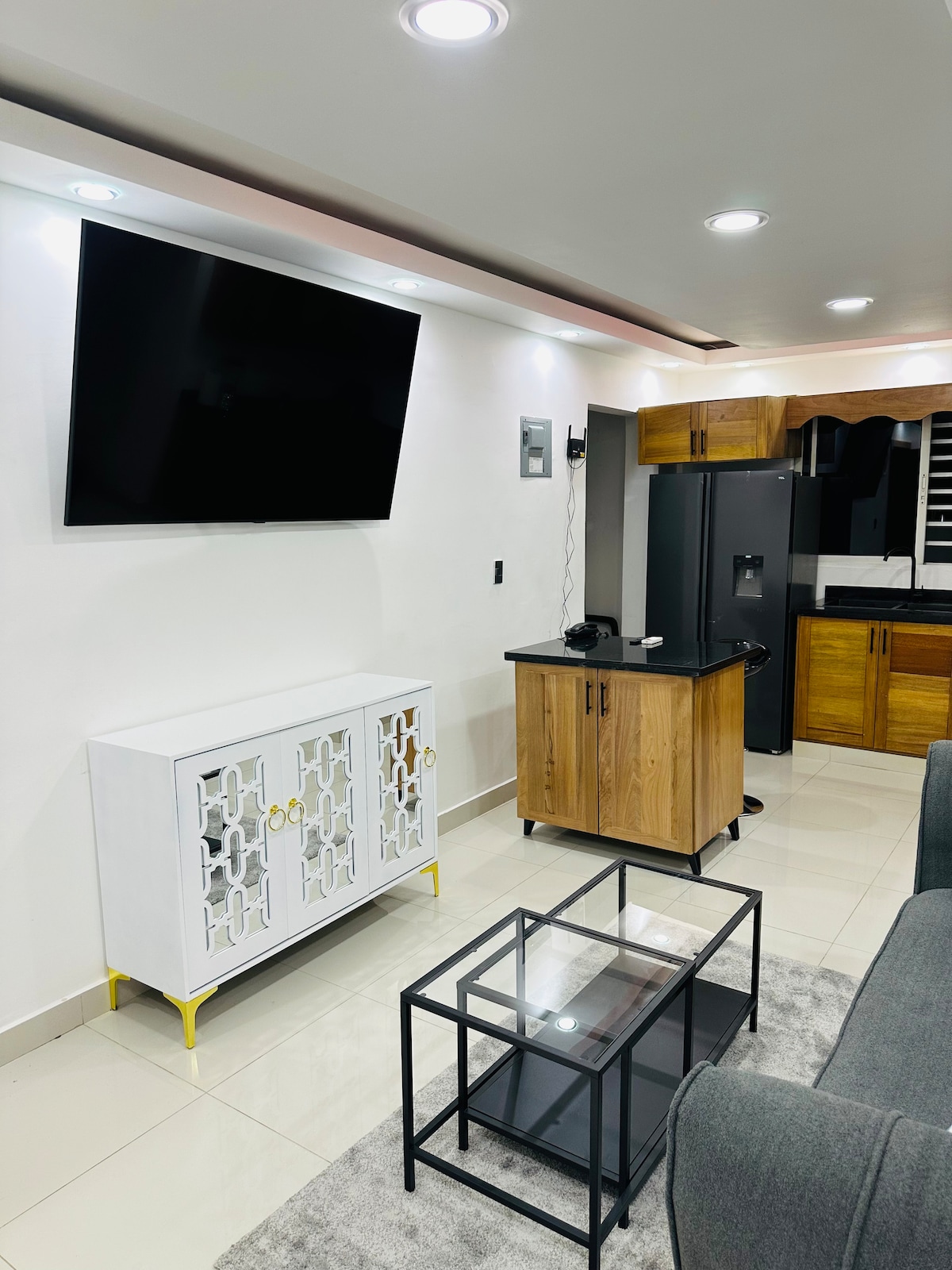 Modern, centric, quiet and private apartment located in the heart of Ensanche Ozama. 2 bedrooms with 43 "SmartTV, living-dining room with 43" SmartTV, kitchen, laundry area, 2 bathrooms, 24-hour doorman, parking with electric gate. Close to shopping centers, bars, restaurants, supermarkets, banks, parks, 27 minutes from the International de las Americas Airport and nightlife. Very safe area, with easy access and travel to any part of the city.