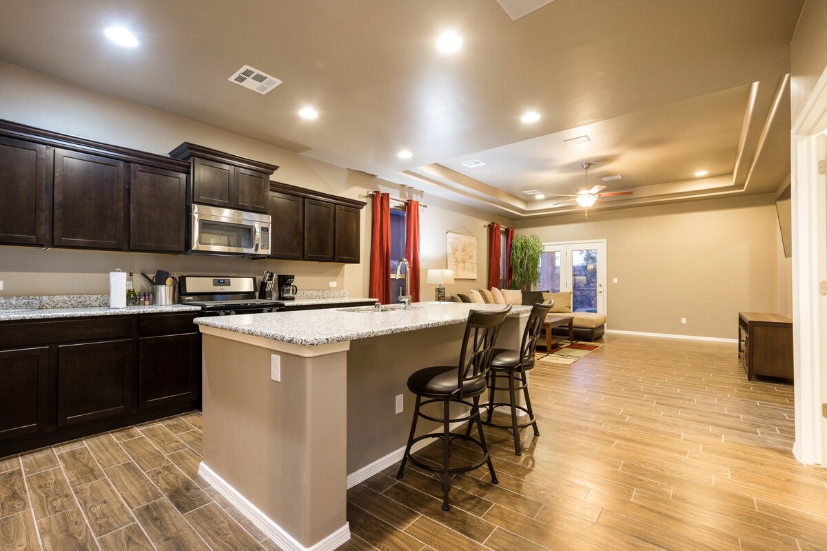 Wake up to breathtaking views of the Organ Mountains from your upper floor or sip morning coffee in the private backyard as the sun rises over the peaks. This modern 4-bedroom, 3-bathroom home near NMSU, Mesilla, and I-10 is designed for comfort, style, and relaxation. Perfect for families, friends, or anyone looking to recharge.