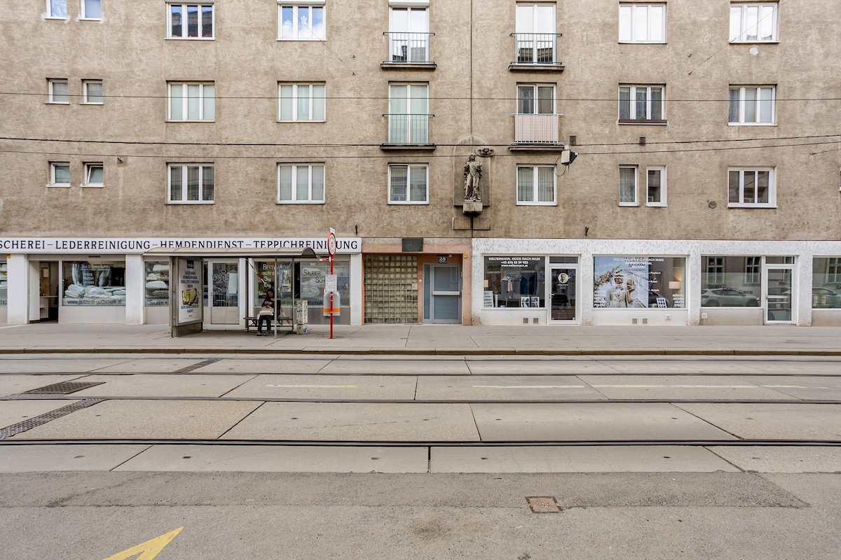 Das Apartment ist ruhig in einer begrünten Seitenstraße gelegen (kein Straßenlärm) und bietet vom Balkon einen schönen, weiten Blick über einen stillgelegten Bahnhof und die Stadt. Dennoch ist die Wohnung nur 1 Gehminute von der S-Bahnstation Traisengasse und 3 Minuten Fußweg von der U6-Station Dresdnerstraße entfernt. Mit diesen Anbindungen ist das Stadtzentrum unkompliziert und bequem (insb. mit der S-Bahn) in 15 Minuten erreichbar.
