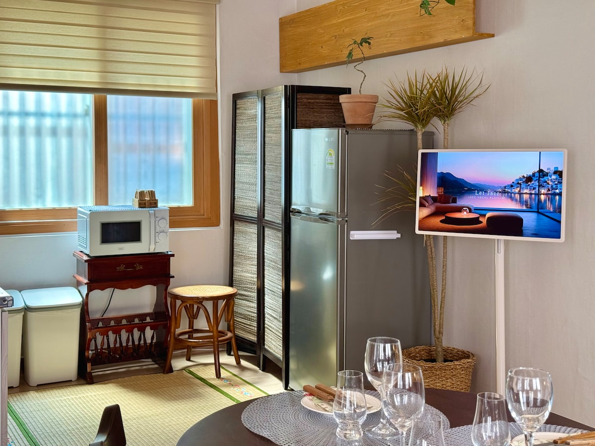 @stay8usanhang is a space overlooking Busan Port, thoughtfully designed to offer comfort and inspiration. Every detail, from music and fragrance to ambiance, interior, and bedding, has been carefully curated to enhance your stay. -Sky bridge connected to Busan Station (5-minute walk) -1 Super King bed, 3 Super Single beds Ocean-view bathtub (spa-ready) - Fully equipped / ideal for family travelers 50-inch large TV with Netflix, YouTube, OTT, and broadcast channels Bang & Olufsen speakers