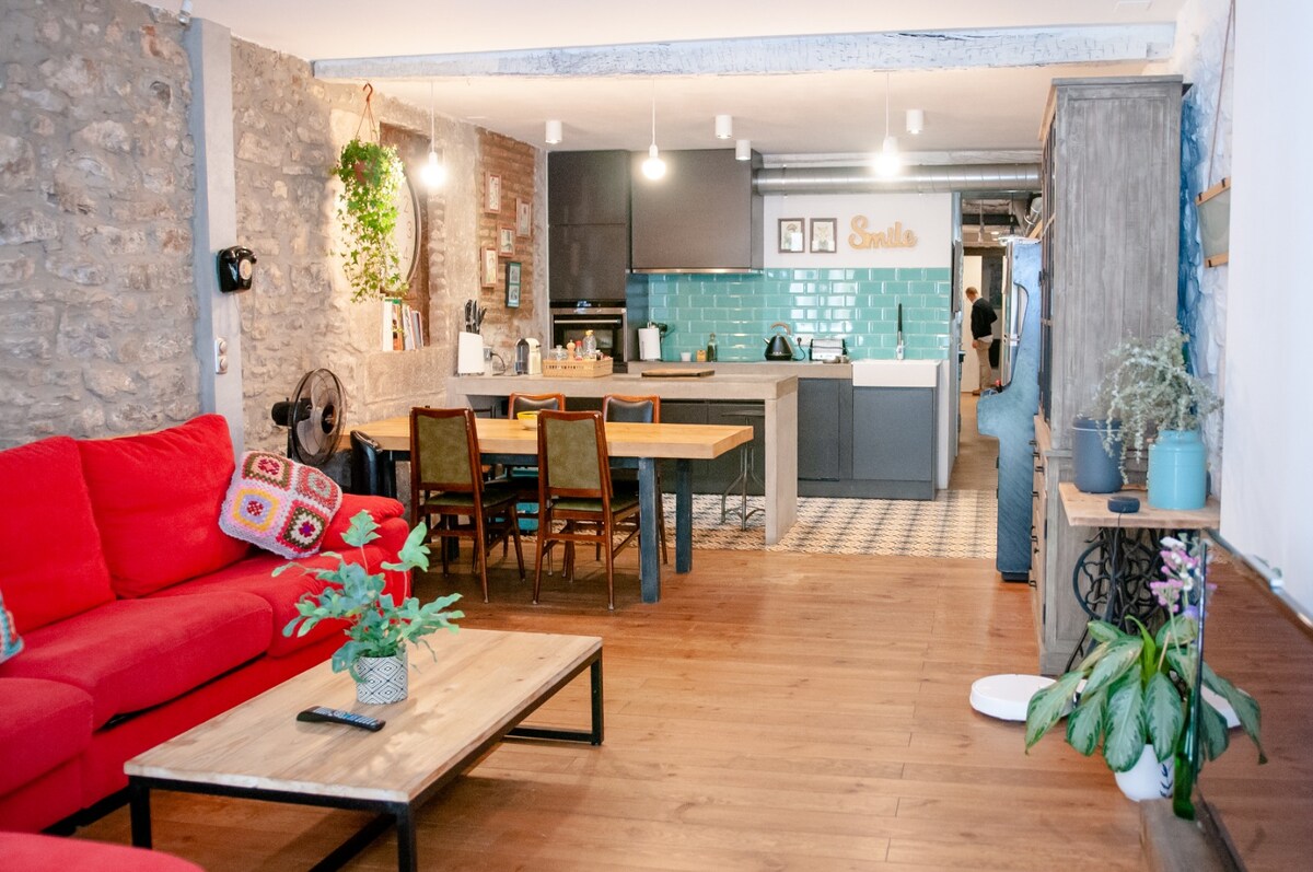 Urban style and cozy, this new one-bedroom apartment with a king-size bed and sofa bed (144x180cm) is located in the heart of the Gros neighborhood, a 1-minute walk from downtown Impeccably newly renovated, it features air conditioning, a 55" TV, Wi-Fi, and a Nespresso. Fully equipped for children and babies. Perfectly located 2 minutes from the bus and train station, as well as next to a direct bus stop to San Sebastian airport.