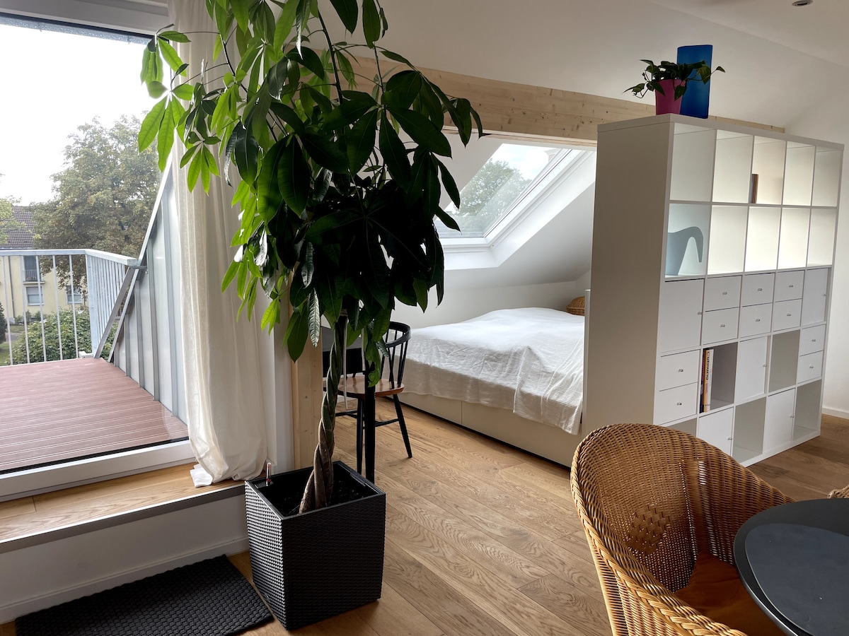 Freshly renovated 50 sqm attic apartment in a well-connected Neuss suburb. The A57 and A46 highways are minutes away. S-Bahn towards Düsseldorf Messe (about 50 min), Downtown (about 20 min) & airport (about 40 min)Cologne center (about 40 min.), as well as a bus towards Düsseldorf University, within walking distance. Bus connection right outside the door (towards Lukas Hospital). The whole apartment was renovated in 2023, including new windows and bathrooms.