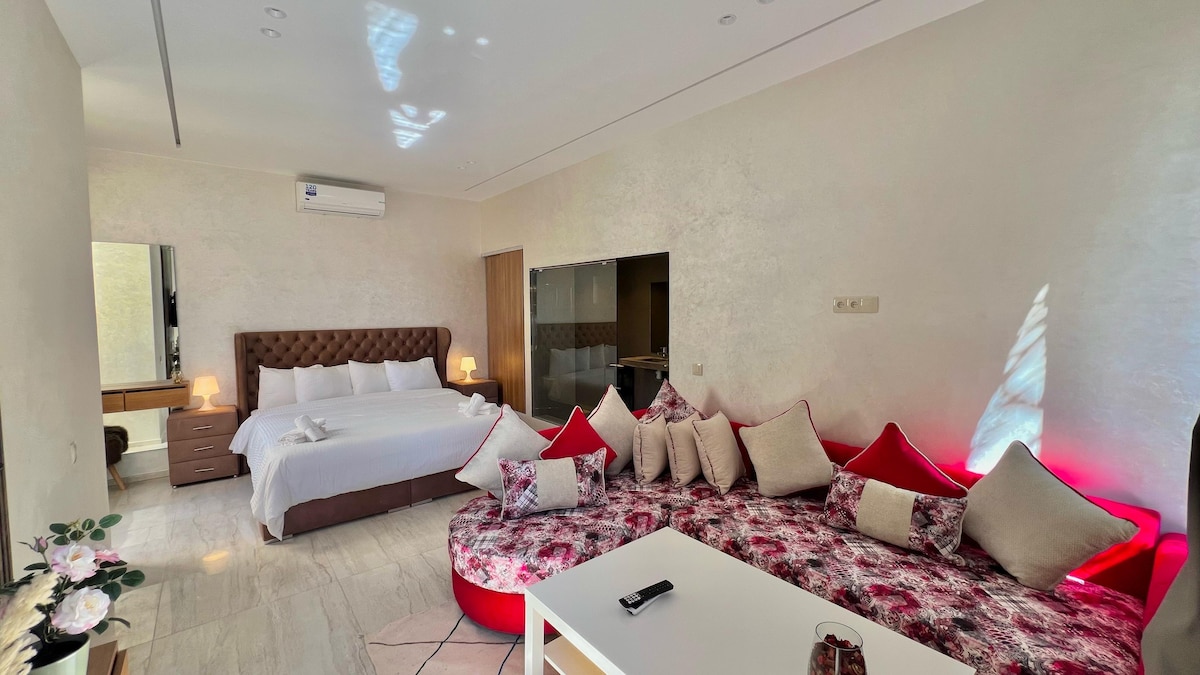 Private riad in Marrakech sleeping up to 8 people, with 3 comfortable bedrooms, each with private bathroom, 3 traditional Moroccan lounges, a bright and peaceful patio, a sunny terrace perfect for relaxing, as well as a pool surrounded by trees. Located only 2 minutes walk from the Almazar Mall, close to the best restaurants, and 6 minutes by car from the famous Jemaa El-Fna Square and 8 minutes from the airport. Calm, comfort, and authenticity guaranteed