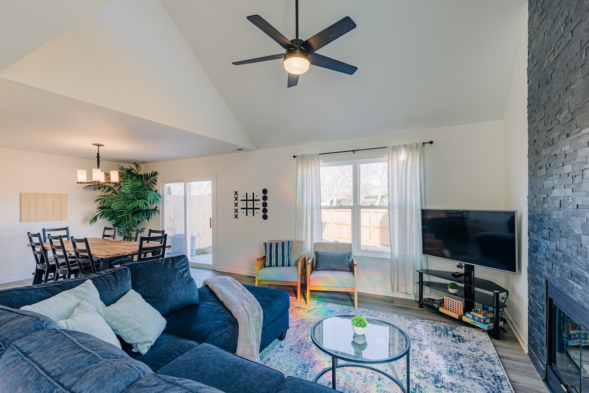 Enjoy ping pong or foosball in the attached garage. Take a nap in the comfy beds or relax on the soft sectional to watch TV. We are located 7 minutes from Walmart, Sprouts, or Dillons and 11 minutes from KU. Many restaurants are located nearby. You can eat at the picnic table in the fenced in back yard, or enjoy a burger made on the electric grill. On chilly evenings you can turn on the gas fireplace to stay extra warm. Four cars can fit in the driveway and there is space on the street too.