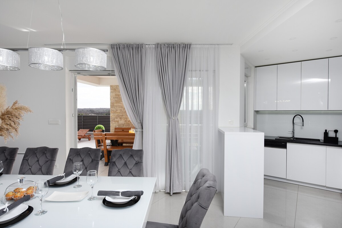 This brand new Villa is located in a quiet location and is surrounded by beautiful nature. The villa consists of 4 bedrooms, a living room with a dining room, a fully equipped kitchen, three bathrooms, a terrace , parking place and a heated pool. All rooms are air-conditioned and one room has a private bathroom. The house is located a 10-minute drive from the most popular sandy beach and 10 minutes from towns of Zadar and Nin. Restaurants and shops are also located near the accommodation.