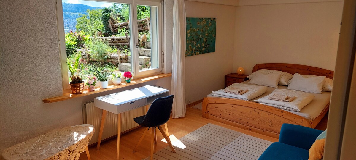 South-facing basement apartment with private entrance and private garden. In a scenic location, without traffic but only 2 minutes to the bus. 12-minute walk to the Goetheanum. Parking is available on the street. The bedroom is very spacious. The TV only has smart TV via the Internet. The kitchen is well equipped but the faucet in the kitchen only has cold water. Hot water is available in the bathroom which is right next to the kitchen. The popular bed is 180 x 220 cm in addition to 2 single beds.