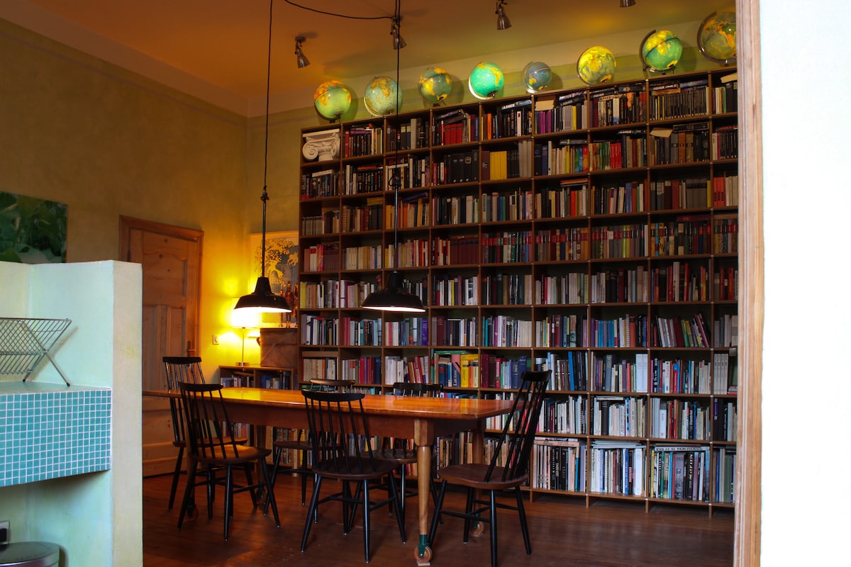 Our garden apartment is on the raised ground floor of an Art Nouveau house from 1906. You have two rooms with a total of 90 square meters at your disposal. A living room and bedroom and a kitchen-living room. All windows and the sunny terrace overlook the garden. Our library invites you to read. Enjoy relaxed and spacious living in a quiet location in the center of Düsseldorf. The large shaker table can also be used for meetings with up to 6 people.