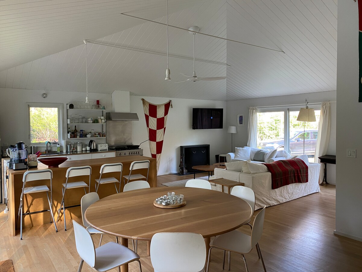 Scandinavia meets Montauk in this sophisticated, comfy, all-season getaway with open-plan interior & large, private fenced yard. • 950 sq ft, 2 BRs (compact but comfy), 1 Ba, full high-end kitchen, W/D, A/C • Wood stove, Solo stove, patio, outdoor shower, high-end linens & furnishings/decor • Steps to LI Sound & Harbor. 3 mi to ocean/Town • Owner is in a private studio w/ own entrance in the house. No shared spaces! • Ask about dogs & flexible rental periods CLICK MORE for IMPORTANT INFO!