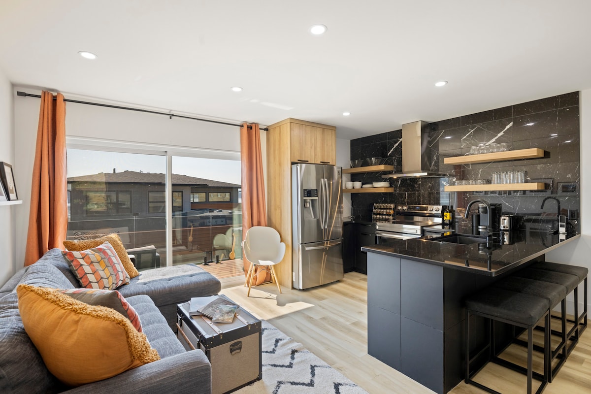 Steps away from downtown Canmore with stunning 180 degree mountain views. Perfect for families and couples. Fully furnished and well equipped, boasting luxury queen beds, in-suite washer/dryer, leather sofas, flat screen TV, Rundle rock gas fireplace, and a plumbed in gas BBQ. Our guests also have access to the fitness centre, indoor pool, kids pool with waterslide, and indoor/outdoor hot tub at the building next door. Free Banff Park Pass and reserved heated underground parking stalls.