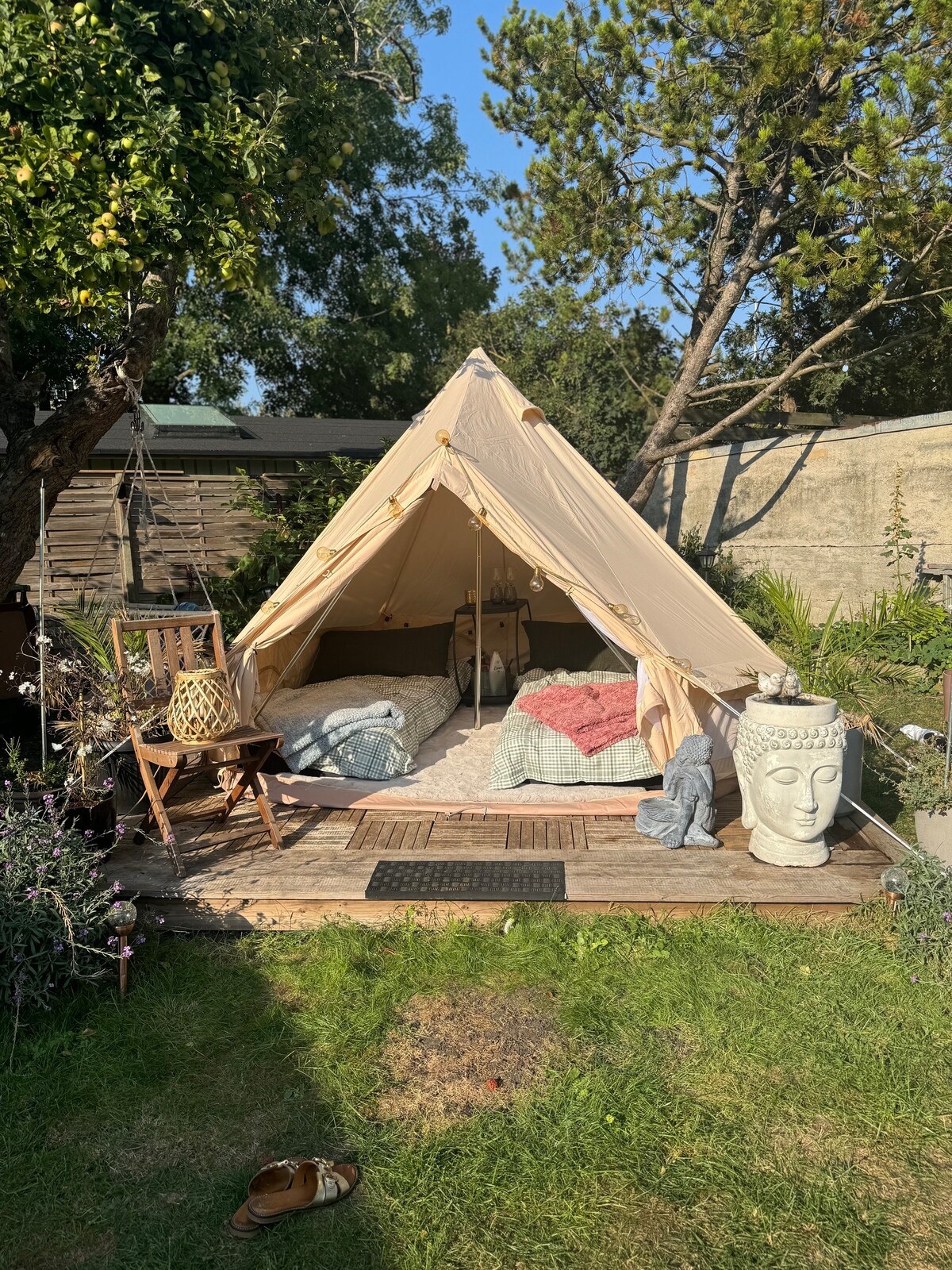 Glamping in nature. The tent is 5 meters in diameter and 3 meters high. There is a terrace in front of the tent with chairs and a table. In the tent is a large, lovely double bed (180 X 200). There is a refrigerator in the tent as well as a wardrobe, chairs and a table. It is located right by Esrum River. There are kayaks, SUP, bicycles, Petanque, campfire and garden games for free use. Wilderness bath costs DKK 700 for 1 day or DKK 900 for 2 days. There is access to a bathroom with a shower. Electricity is free to use in the tent.