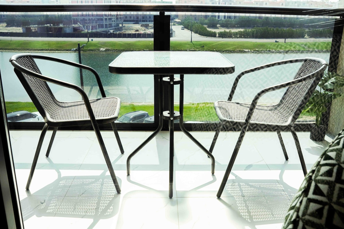 Enjoy a comfortable stay in a stylish apartment with stunning views of the lake. It has a spacious bedroom with a large window and natural lighting, and a smart TV with Netflix and Shahid subscriptions. The lounge also has a comfortable sitting area and another smart TV for more entertainment. The kitchen is fully equipped with all your needs: microwave, coffee machine, fridge, kettle as well as a washing machine. For entertainment lovers, there is a dedicated game room with a hockey table suitable for friends and family The apartment is bright, quiet and perfect for rest or work, with modern design and complete privacy