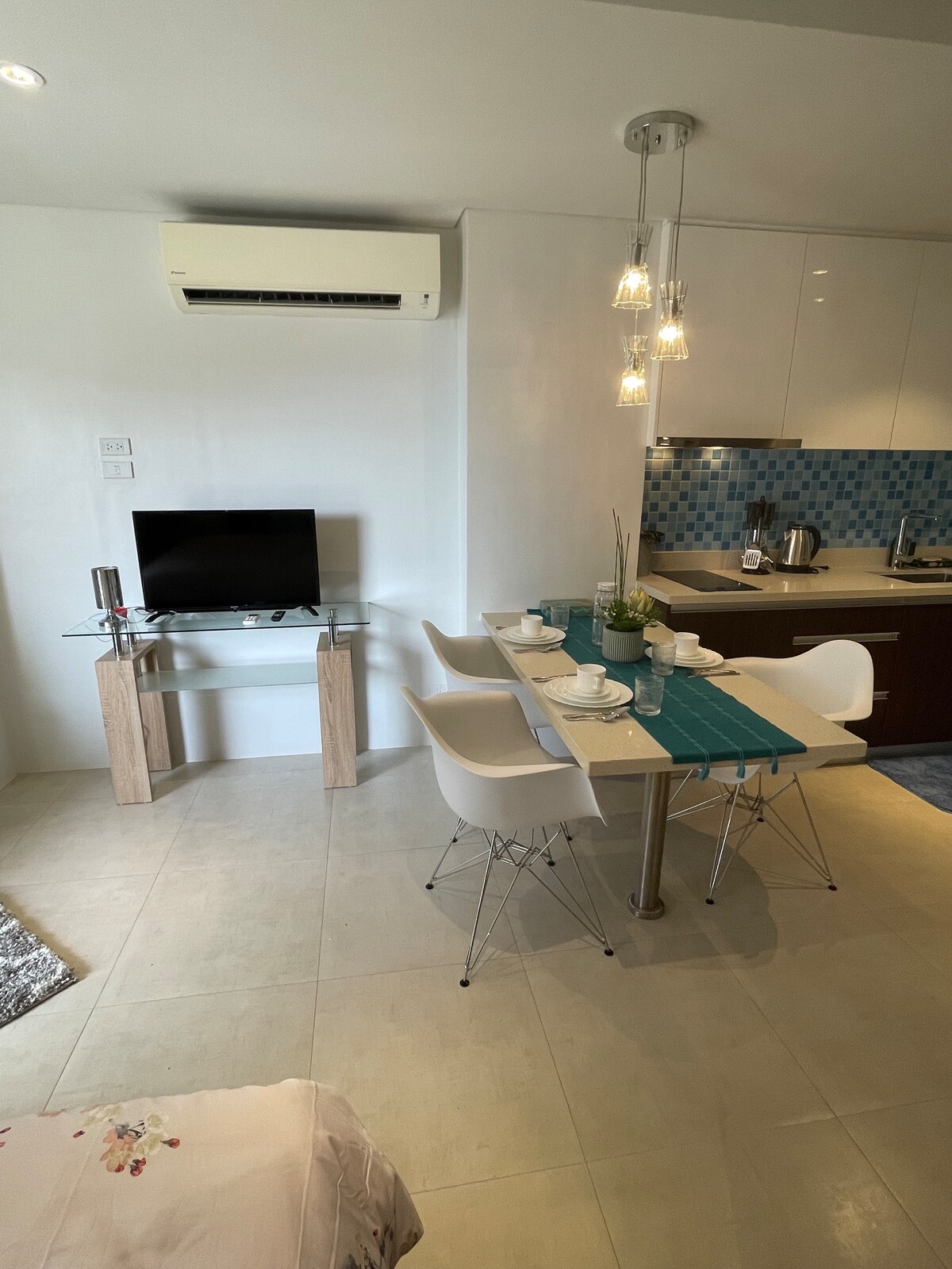 Resort lifestyle inside a private, lush green community. 1. Free to explore the Tambuli Resort and Spa compound 2 Free Residential Lap Pool Access 3. Great view of the Ocean & City from private balcony 4. 2 Queen beds (1 pull-out) + single sofa bed 5. Workspace w/ sea view + charging station (int'l. outlets) 4. Android TV, Netflix & 300Mbps WiFi 5. Vanity area w/ hairdryer 6. Fully equipped kitchen + purified drinking water 7. Washing machine, drying rack & luggage racks 8. Extra linens free
