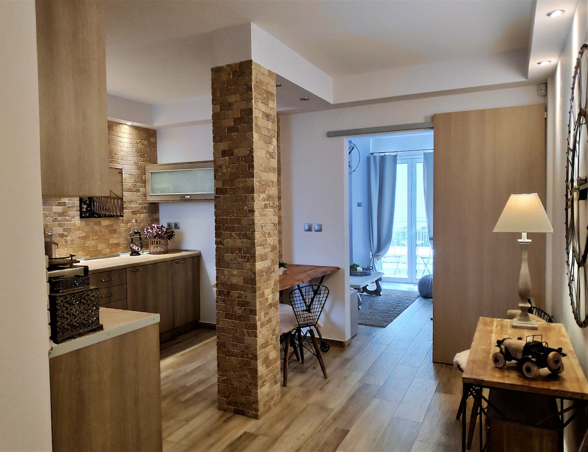 The apartment is located in the center of Piraeus and next to the port. Metro, airport connection, ferries, train, suburban train, bus station and tram all within 100 meters. Central location!! The apartment you are going to stay in is brand new and fully renovated with bedroom, kitchen, living room 69 square meters with high standards and designed by an excellent architect. Located on the 4th floor. It is comfortable and luxurious to make your stay unforgettable!