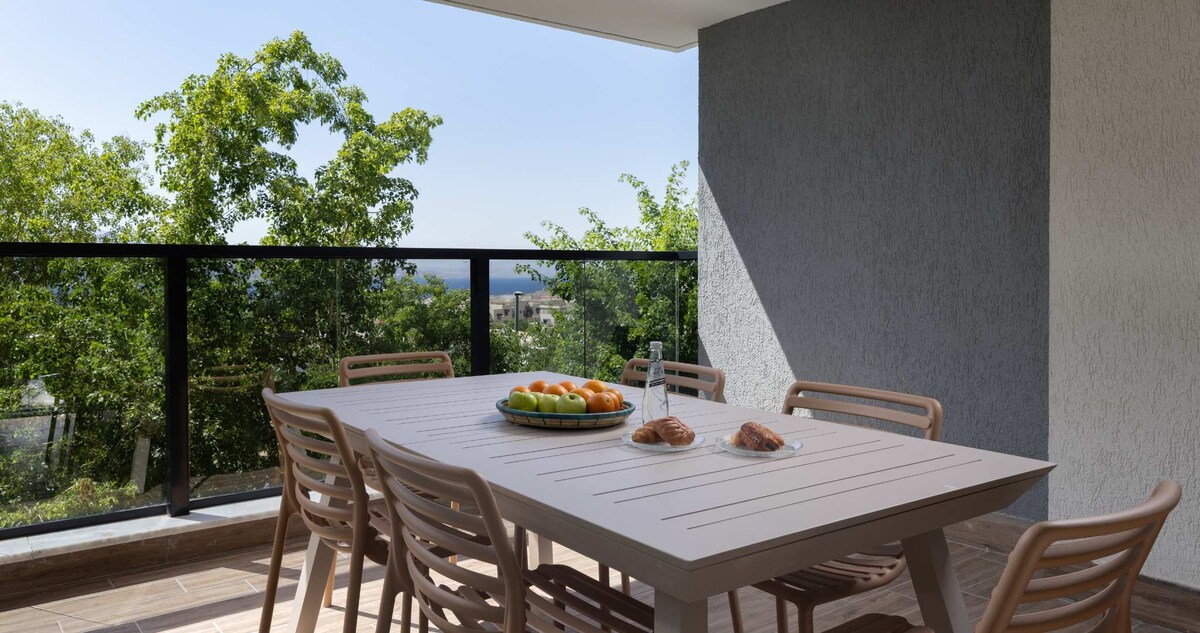 large apartment with stunning sea views. Suitable for families. private roof with a professional BBQ and seating areas. designed and beautiful, fully equipped. Located in a prestigious location in the city, quiet and peaceful. • Large and fully equipped apartment for a couple and family vacation for up to 6 people • Wide view terrace with seating area facing the spectacular views of the sea • Huge private roof with professional BBQ and seating area, stunning sea views. •