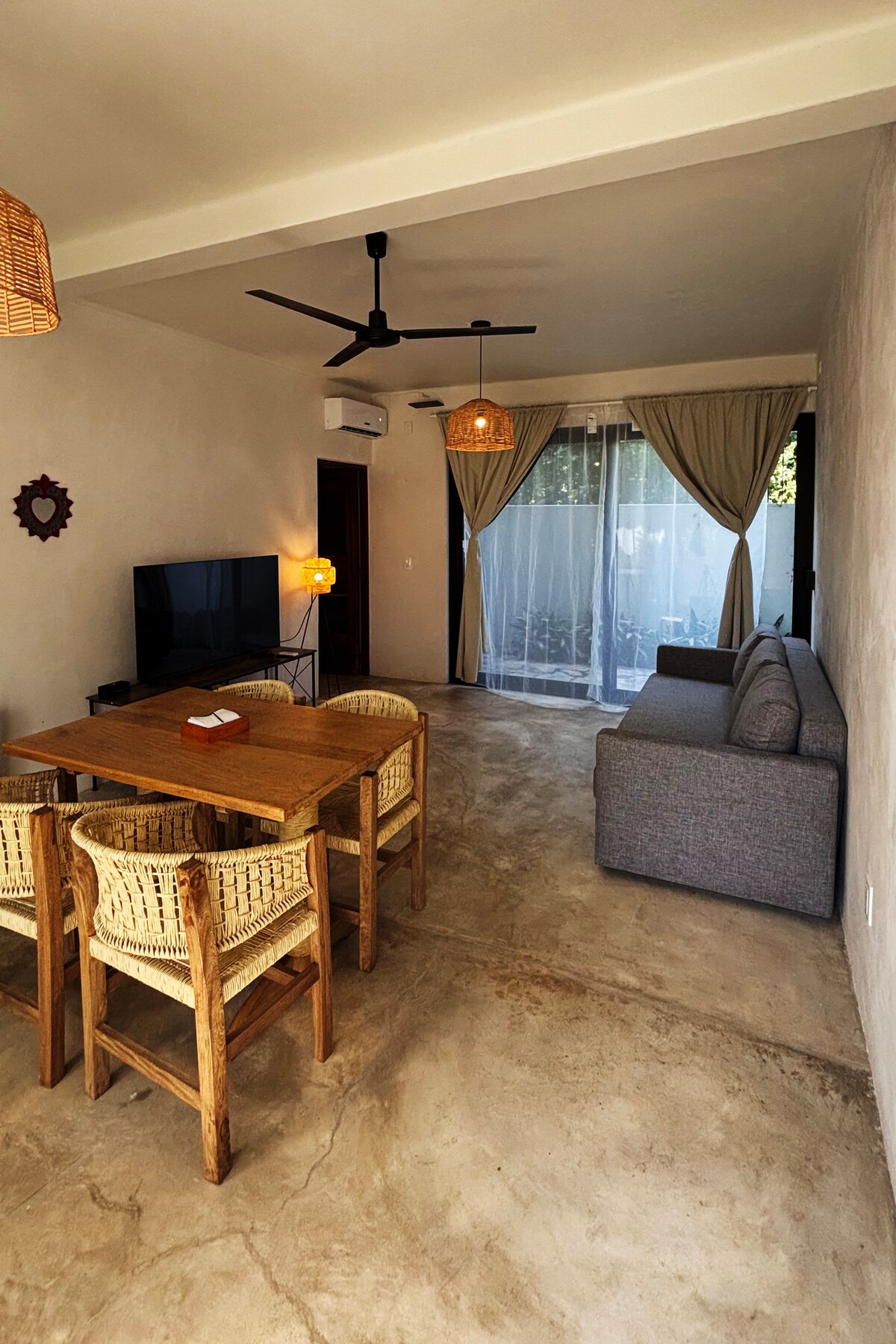 Located in Punta Zicatela, just a few minutes' walk from the beach, restaurants, and other attractions. With excellent internet both optic fibre and Starlink. Queen-size bed, AC, ventilator, kitchenette with fridge, coffee maker and water filter. A full bathroom, and a small closet. It features a balcony with a small table and two chairs, and wooden blinds with a view to the garden. Additionally, it has a private terrace on the second level, with a beautiful view, a small table and chairs.