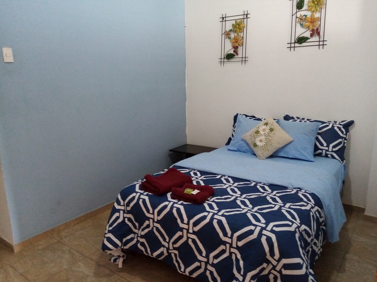 The apartment is independent, furnished, comfortable, very bright, clean, and easy to access. You can share an outdoor area of gardens and living areas under trees. The location is strategic: two blocks from Mall del Pacifico and two blocks from El Murciélago beach. Connects with Ave. Flavio Reyes, which has bars, restaurants, churches, supermarkets, pharmacies, hairdressers, and wide sidewalks for walking. The area is safe and equidistant from downtown.