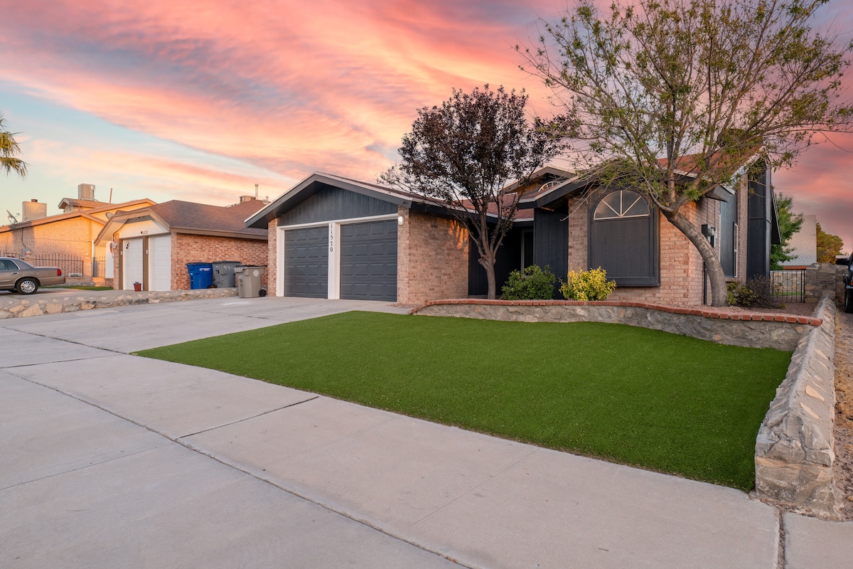 Discover a cozy farmhouse-style home in Far East El Paso's serene suburbs, just 25 mins from El Paso Airport and 22 mins from Fort Bliss. Near TX-375, it's conveniently close to Cinemark Theater, Starbucks, McDonald's, Wendy’s, Wingstop, Circle K, Super Walmart, and Famous Dave’s BBQ—all within 2 miles. Ideal for families, this home features a converted game room with a pool table, arcade, lounging area, and a big TV, offering a comfortable retreat while exploring El Paso's attractions.