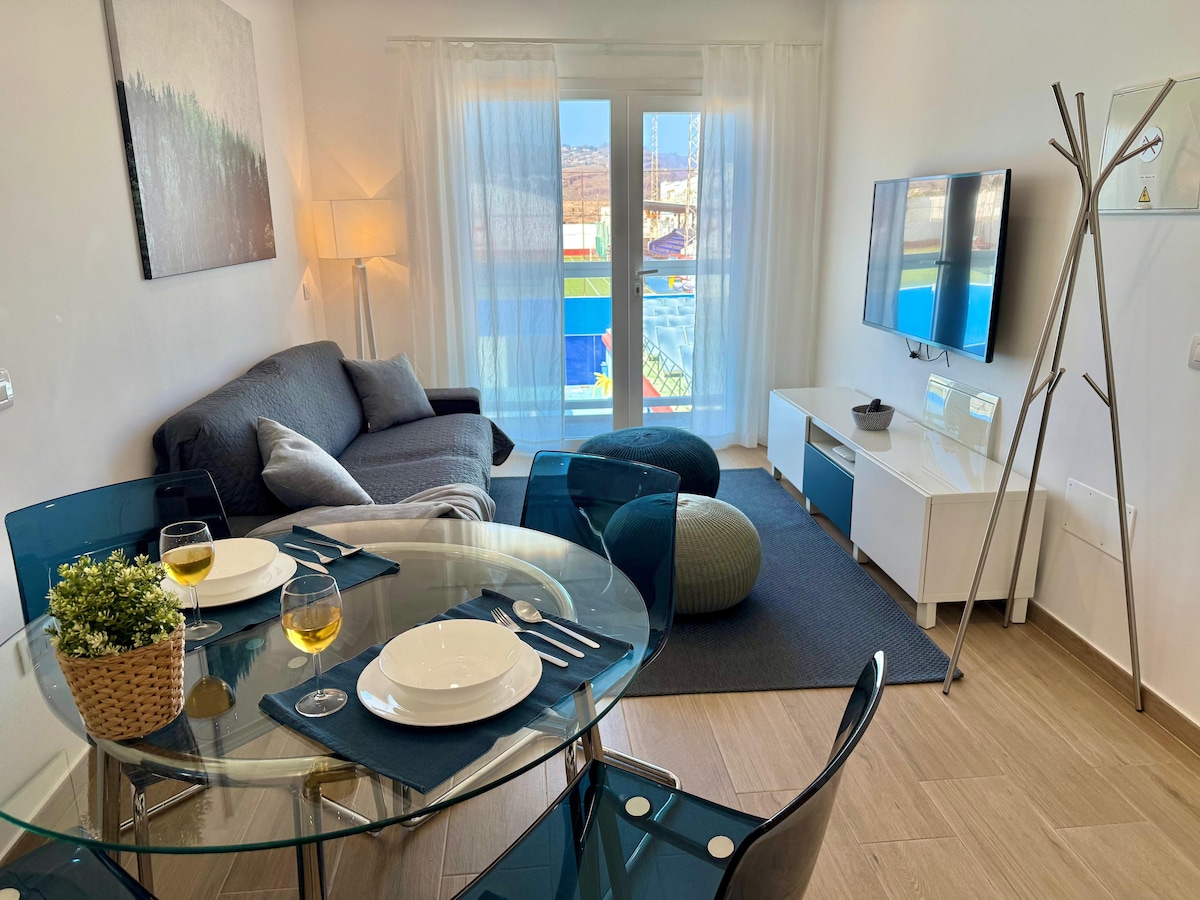 Brand new apartment with a living room, kitchen, 2 bedrooms, bathroom and small balcony. Functional modern style and very cozy in a building of 4 units, central, soundproofed, next to municipal sports facilities with municipal pool. Located in the Tablero de Maspalomas, a quiet neighborhood of residents, but only a 5-minute drive from the beaches of Maspalomas and Playa del Ingles, and the tourist areas. Air conditioning in the living room and the 2 bedrooms.
