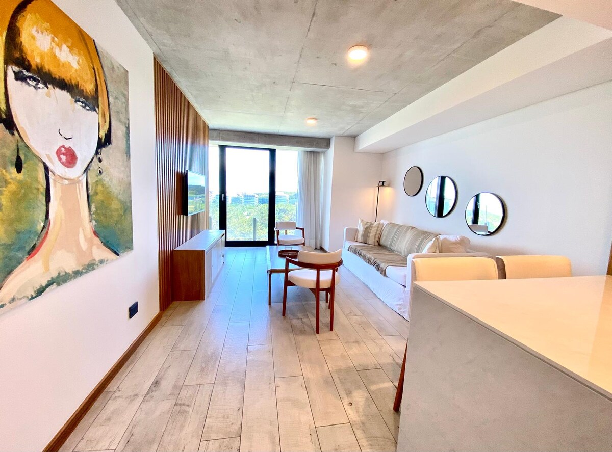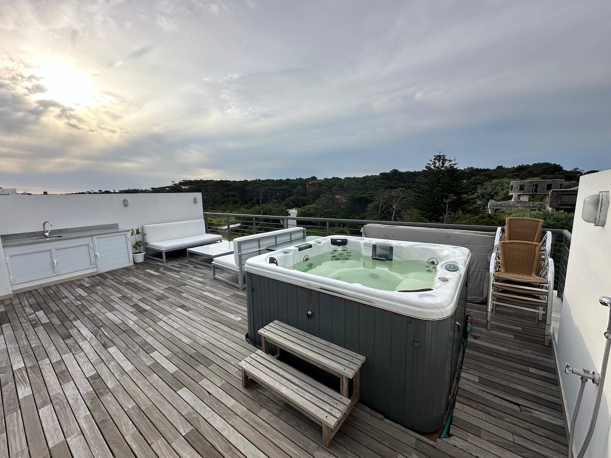 Spectacular apartment in Punta Ballena on the seafront. Next to Casa Pueblo, house and museum of the artist Carlos Páez Vilaró. It has 2 en-suite bedrooms, an integrated kitchen and dining room, a living room and a large terrace. Air conditioning and automatic blinds. Sheets, towels, beach chairs, and umbrella included. Optional maid service at an extra cost. Optional bicycles at an additional cost.