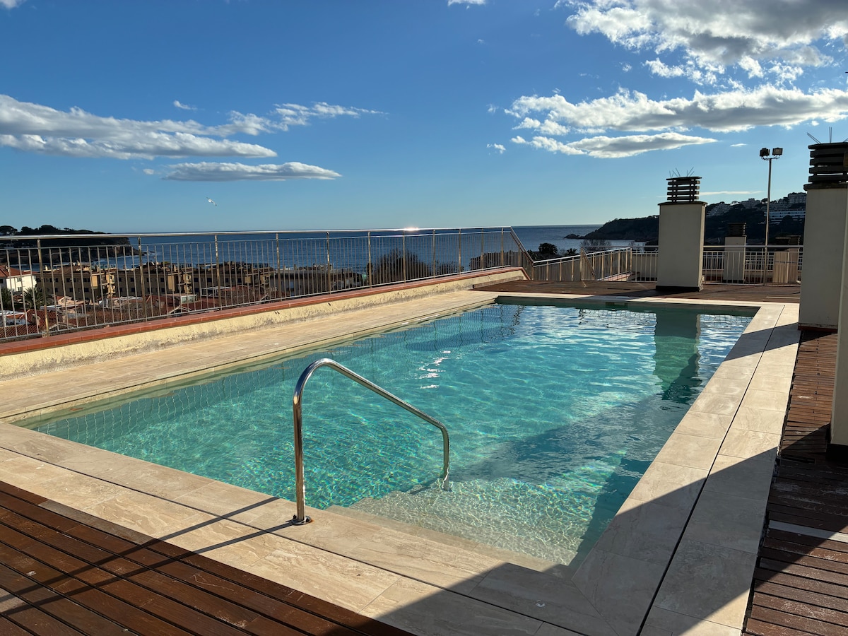 Unique panoramic views of the bay of S’Agaró. Duplex apartment with two double bedrooms and two bathrooms on the upper floor, and a living-dining area with a fully equipped kitchen facing the sea on the lower floor. Decorated with artwork and original 20th-century design pieces. Spacious terrace with sofas to enjoy the views. Private parking and communal pool. Direct access to the beach just a 5-minute walk away and 10 minutes from the restaurant and shopping area of S’Agaró.