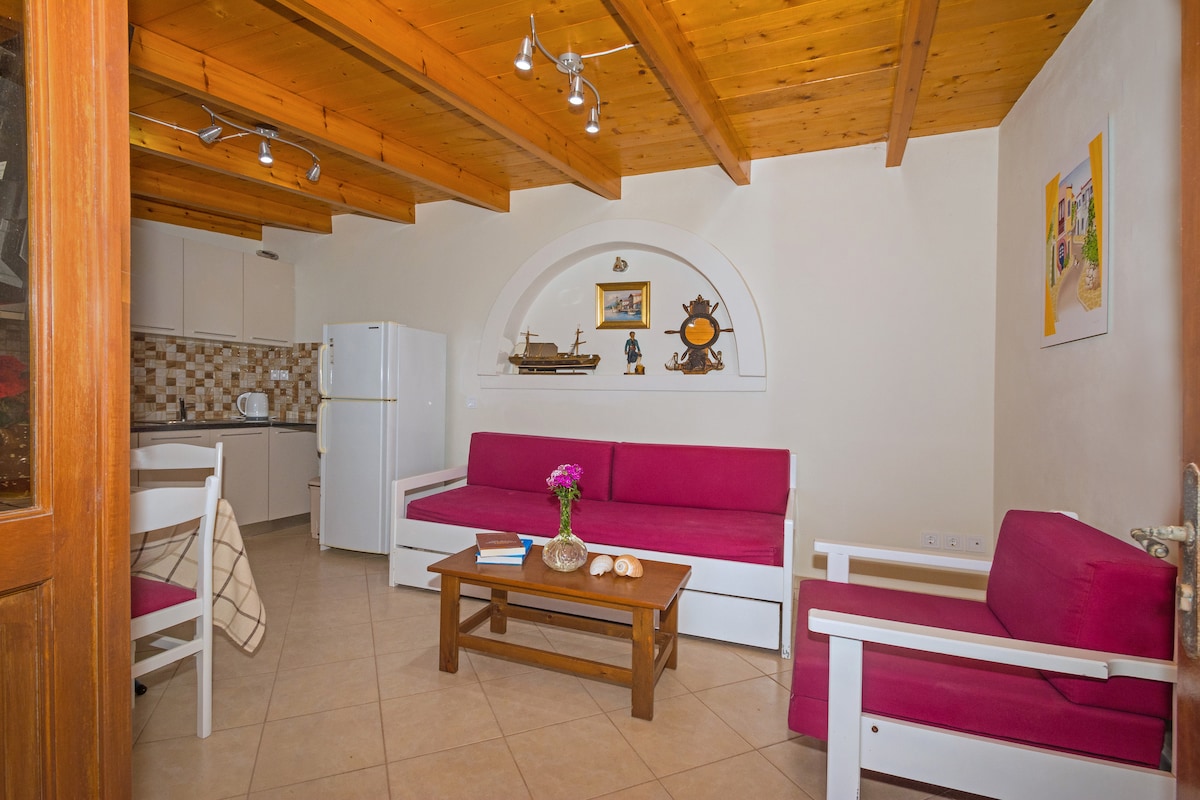 The apartment is located in the center of the settlement 30meters from the shore , 100meters from the exit of ferries. It's a studio/apartment with a double bed and there is also an extra sleeper seat section for an additional guest. The apartment is equipped with fridge and appliances for breakfast preparation!
