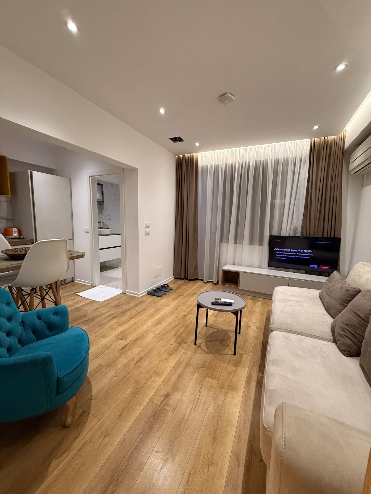 Stay in a modern 1-bedroom apartment in Tirana city center, ideal for up to 4 guests. Newly renovated with an open-plan layout, it features a full kitchen, air conditioning, smart TV, and fast Wi-Fi for a comfortable short or long stay. Enjoy a private terrace and patio with city views, perfect to unwind after exploring. Just 10 minutes walk to top attractions, cafes, and restaurants. A stylish base for a couples or friends getaway - book now!