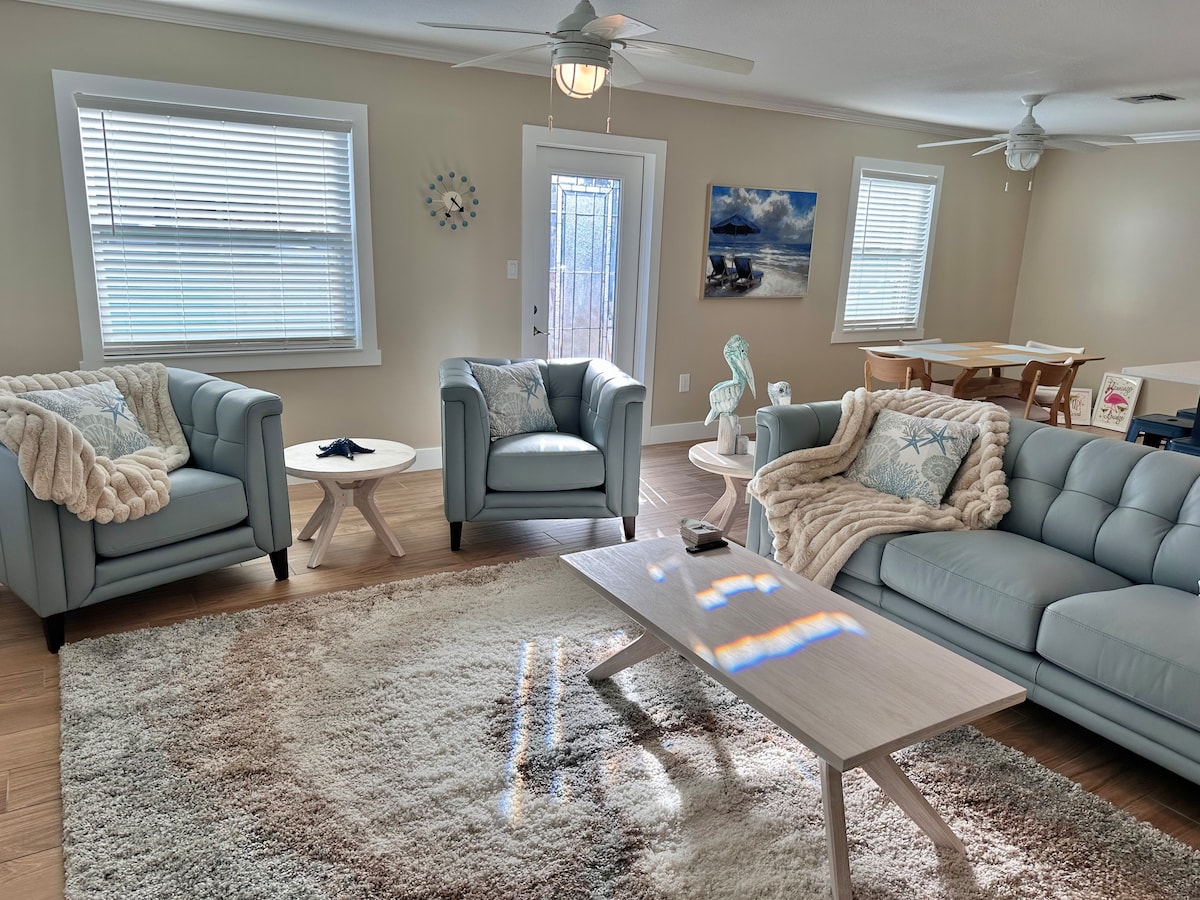 You'll find a perfect mix of togetherness and privacy in this fun and well appointed island home. This listing is a duplex that includes two separate 2 bedroom one bath suites. Each with there own kitchen, living room, bath, and bedrooms. Guests can enjoy time spent together and still have the ability to retire to individual suites in complete privacy at any time. Included in your stay will be a TIKI bar with outdoor TV, heated swimming pool, bicycles, kayaks, Sups, beach chairs and more!
