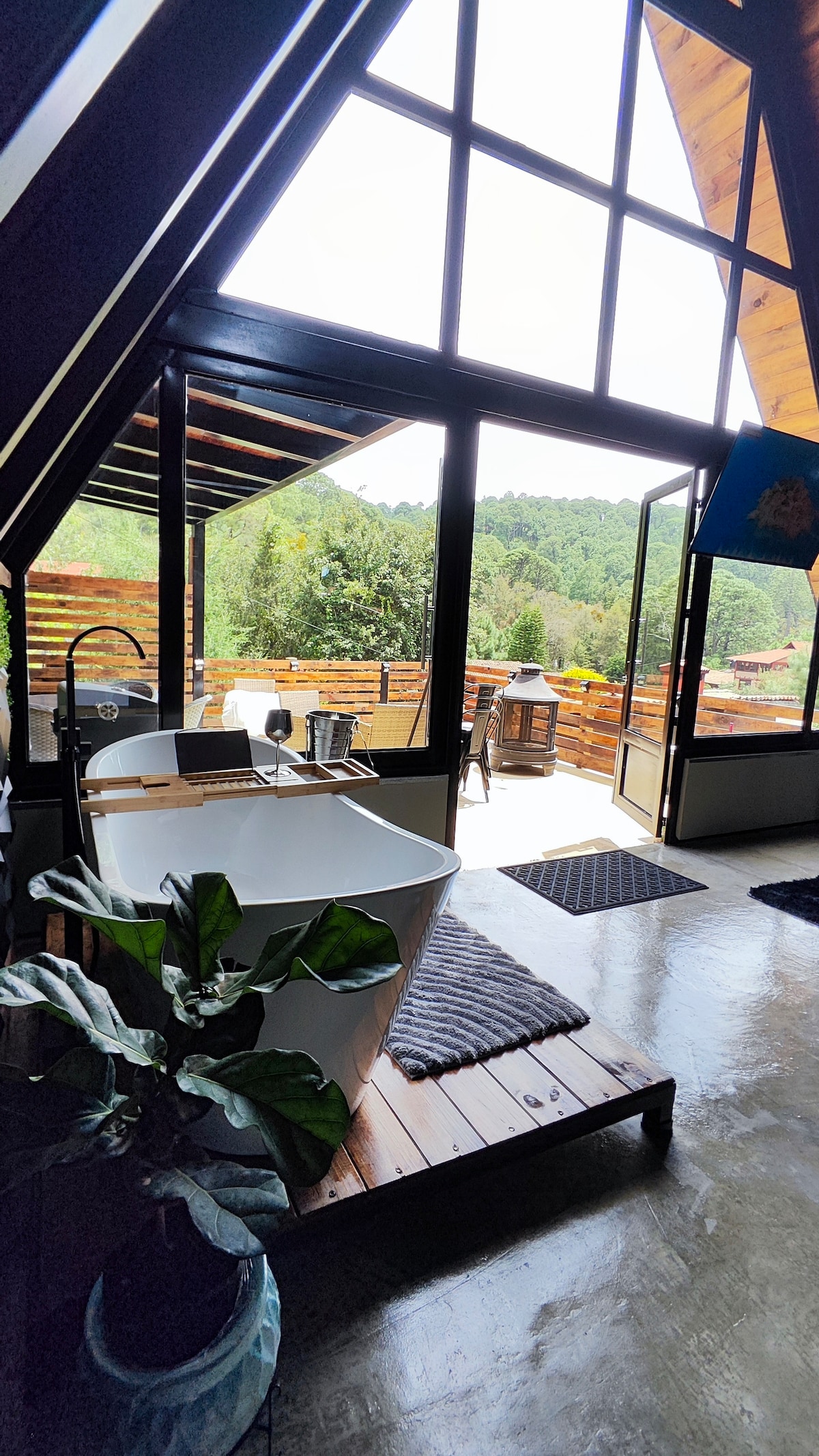 Cabaña en Mazamitla con diseño unico que tienes que conocer por ti mismo! 1 recamara en planta alta con cama King size, sofa cama en planta baja, bañera con vista a jardin privado, TV LED inteligente con Netflix, Disney +, e internet Starlink. Esta a tan solo 7 minutos de la plaza municipal de Mazamitla.