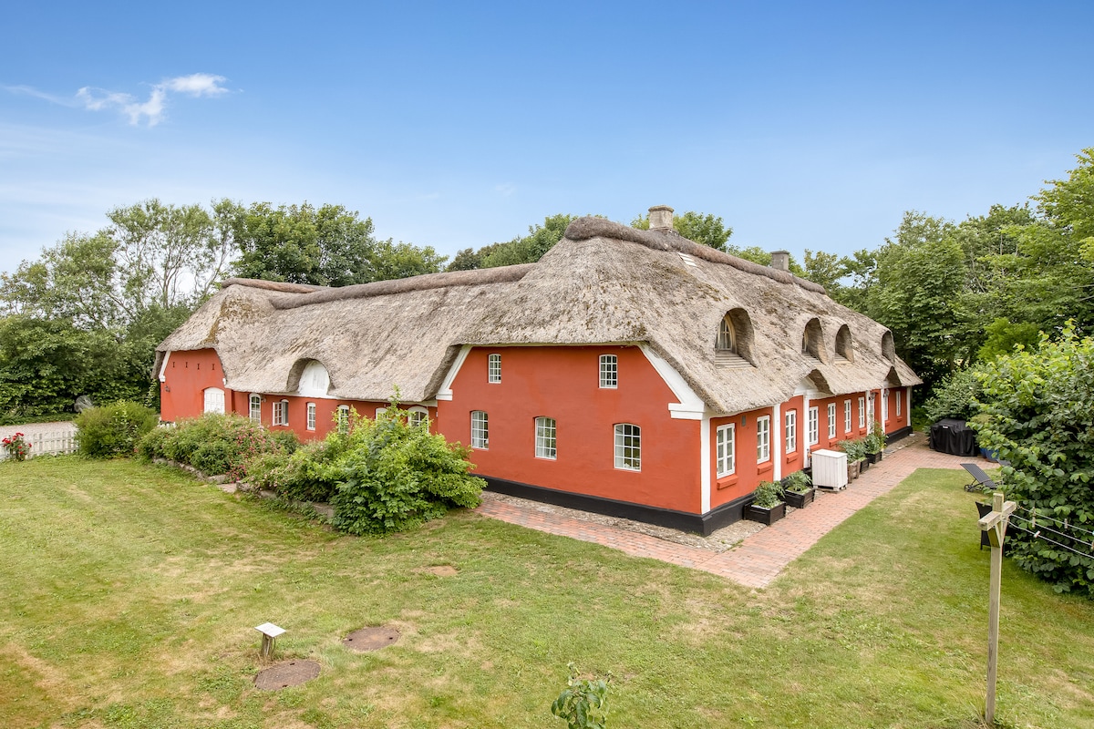 Alsbrogaard is an old farm in classic Danish country style with a thick thatched roof and rustic windows. The farm has been carefully restored with respect for the past and the nature of the place. Modern amenities and luxury have been added with natural stone in bathrooms, solid wooden walls, beautiful panels, rosettes and thick walled walls. Outdoors, we have also provided experiences for the whole family with a fire pit, gas grill, playhouse, trampoline, 2 hectares of natural land, terraces, ball games and a covered dining area.